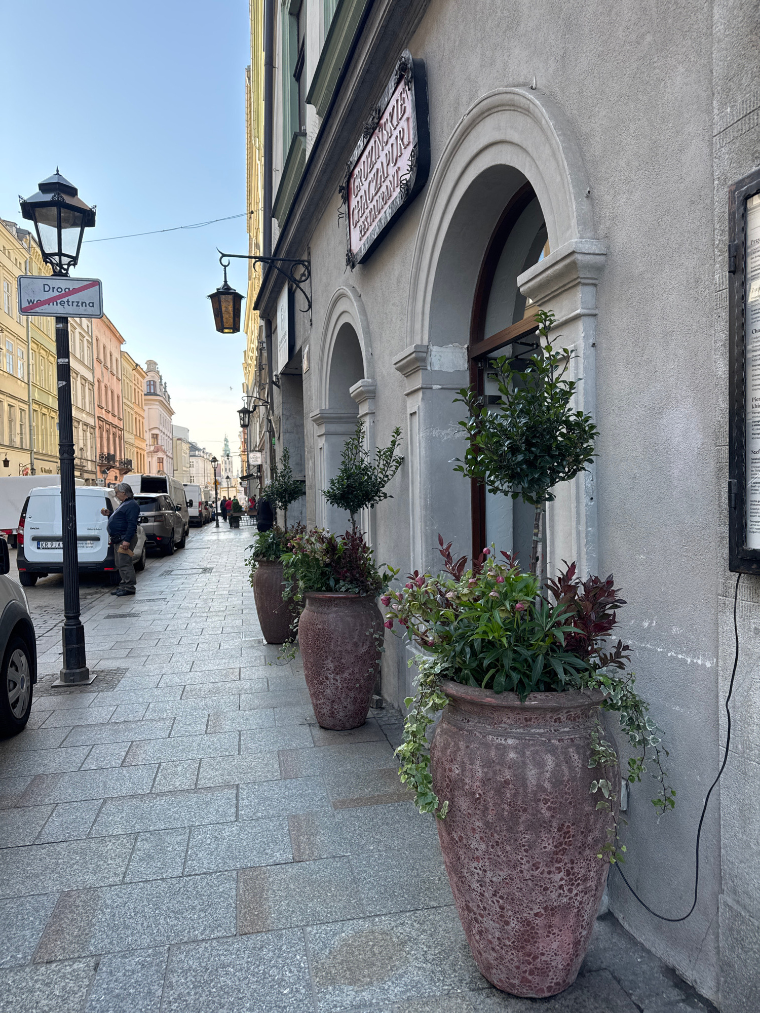 The image depicts a street scene in Krakow, Poland. The perspective is from street level, looking down a narrow street lined with buildings on both sides. The architecture is a mix of older, tradition…read more