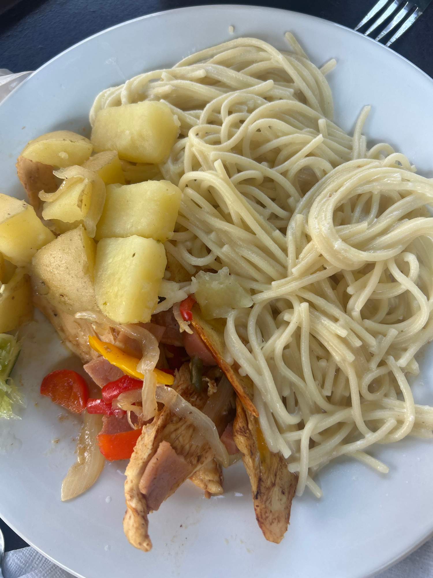 A top-down view of a white plate filled with spaghetti, potatoes, and stir-fried vegetables, possibly chicken or another light-colored meat. The spaghetti takes up the top left portion of the plate, w…read more