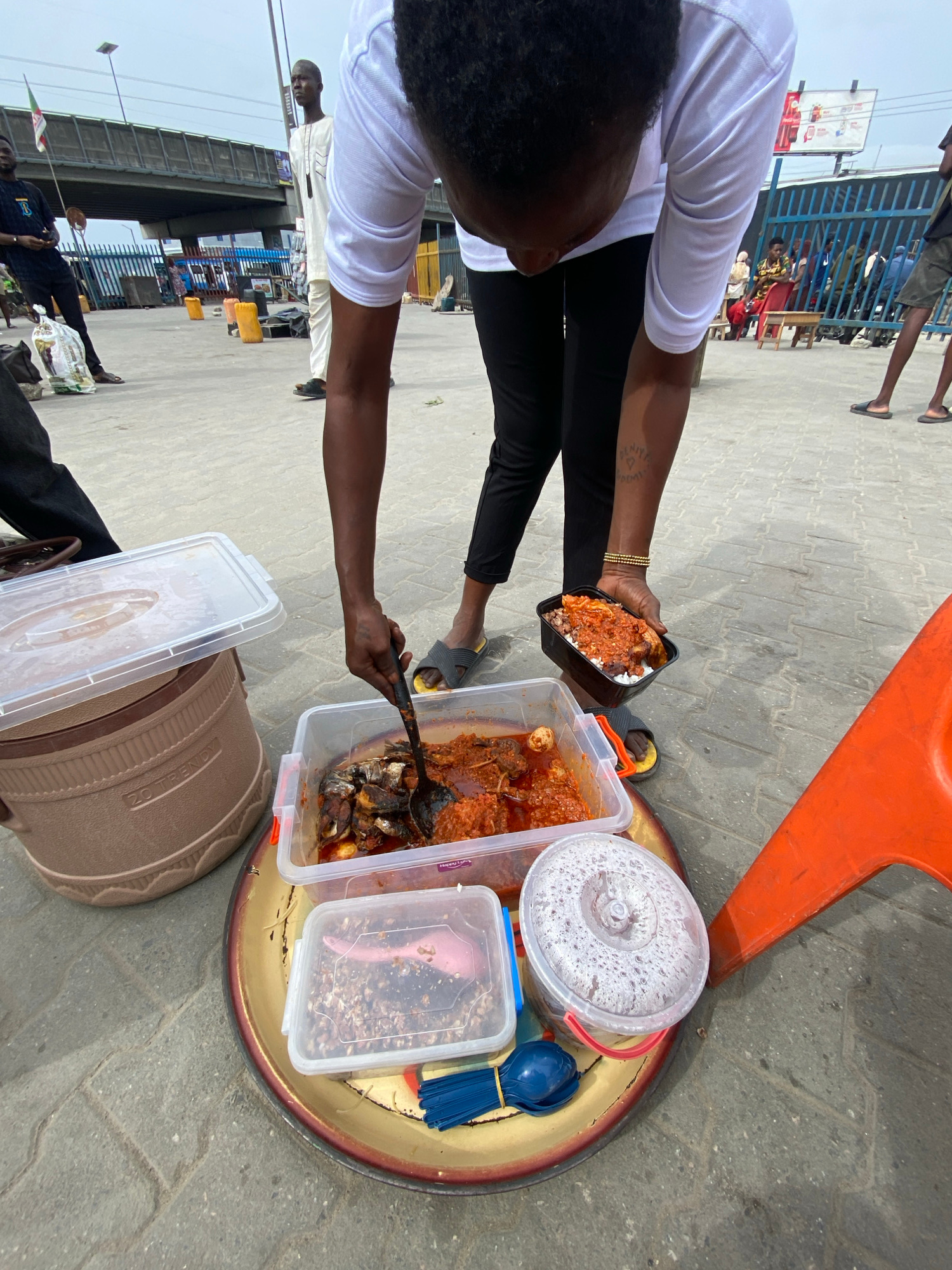 An overhead medium shot captures a street vendor in Lagos, Nigeria serving food. The vendor, dressed in a white shirt and black pants, is holding a black takeout container filled with rice and stew in…read more
