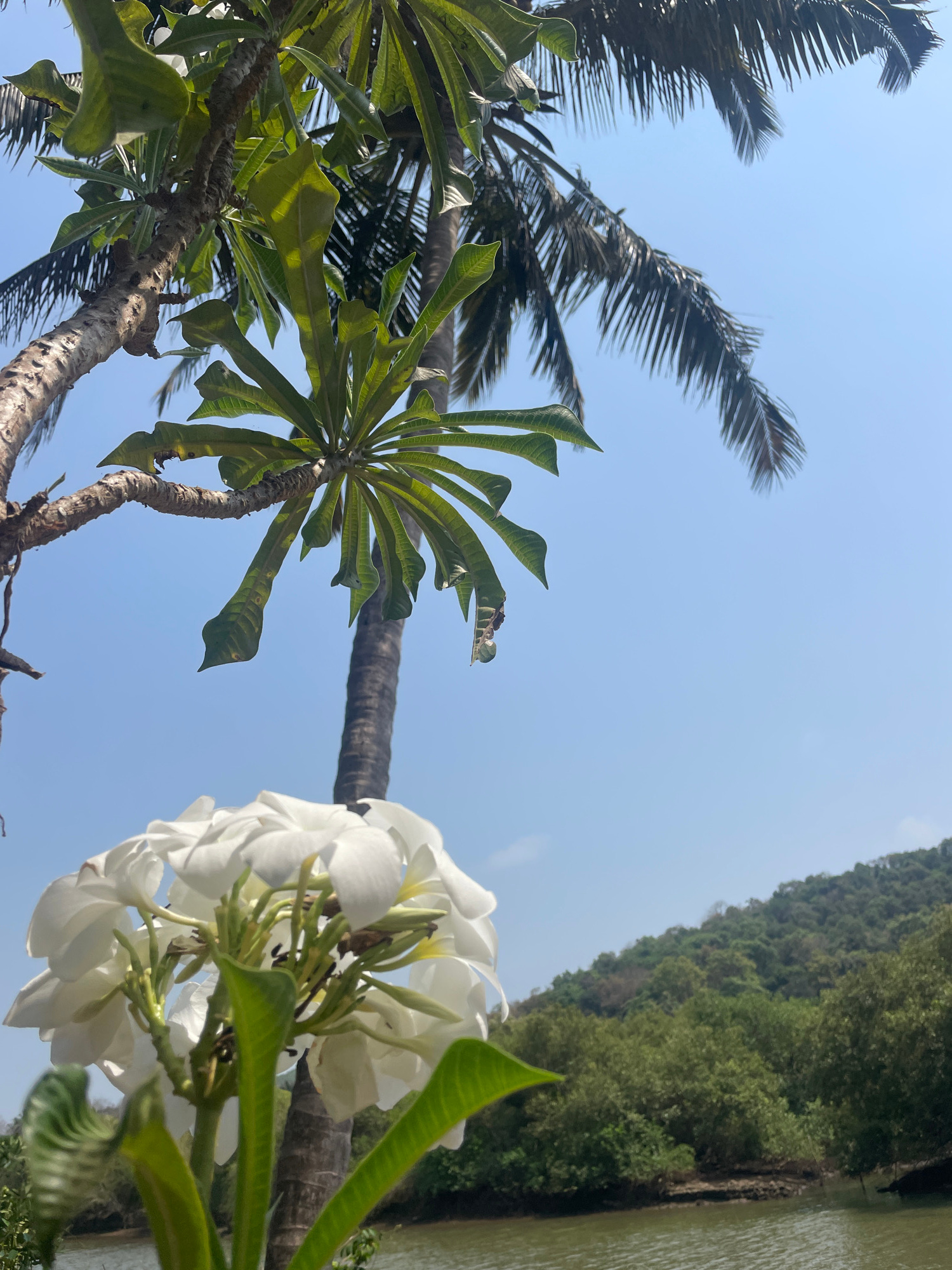 The image is a low-angle shot of a tropical scene in Marna, India. In the foreground, there is a cluster of white frangipani flowers with visible green leaves. Behind the frangipani, there's a palm tr…read more