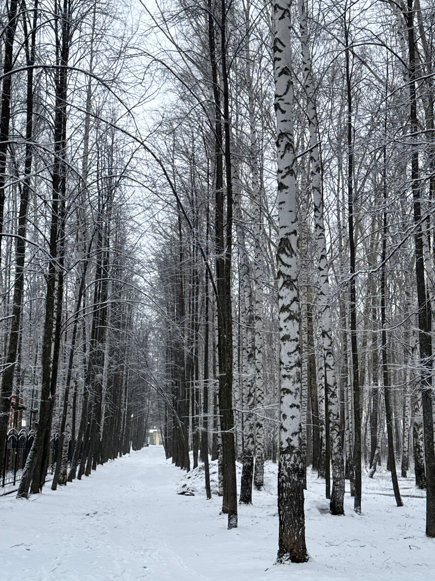 The image depicts a snowy avenue of birch trees, identifiable by their distinctive white and black bark patterns, in the city of Chaikovsky, Russia. The trees stand in neat rows along the path, their…read more