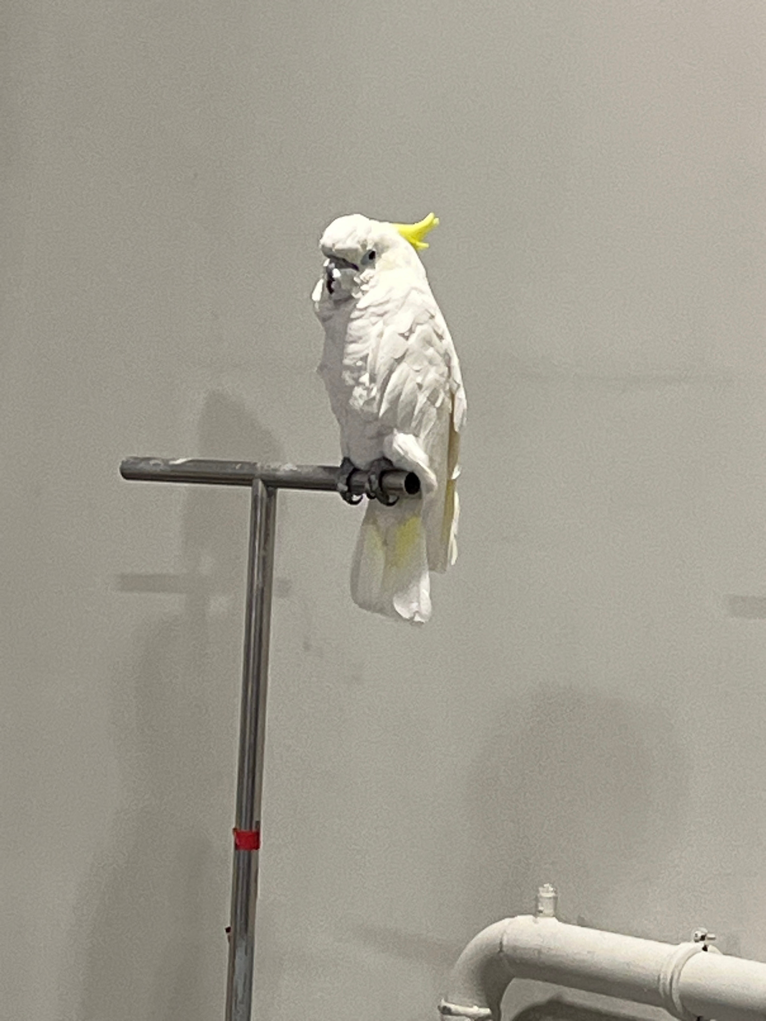 A Sulphur-crested cockatoo perches on a metal stand. The background is a plain, light gray wall with white pipes visible in the upper right corner. A red label is on the metal stand. The location is u…read more