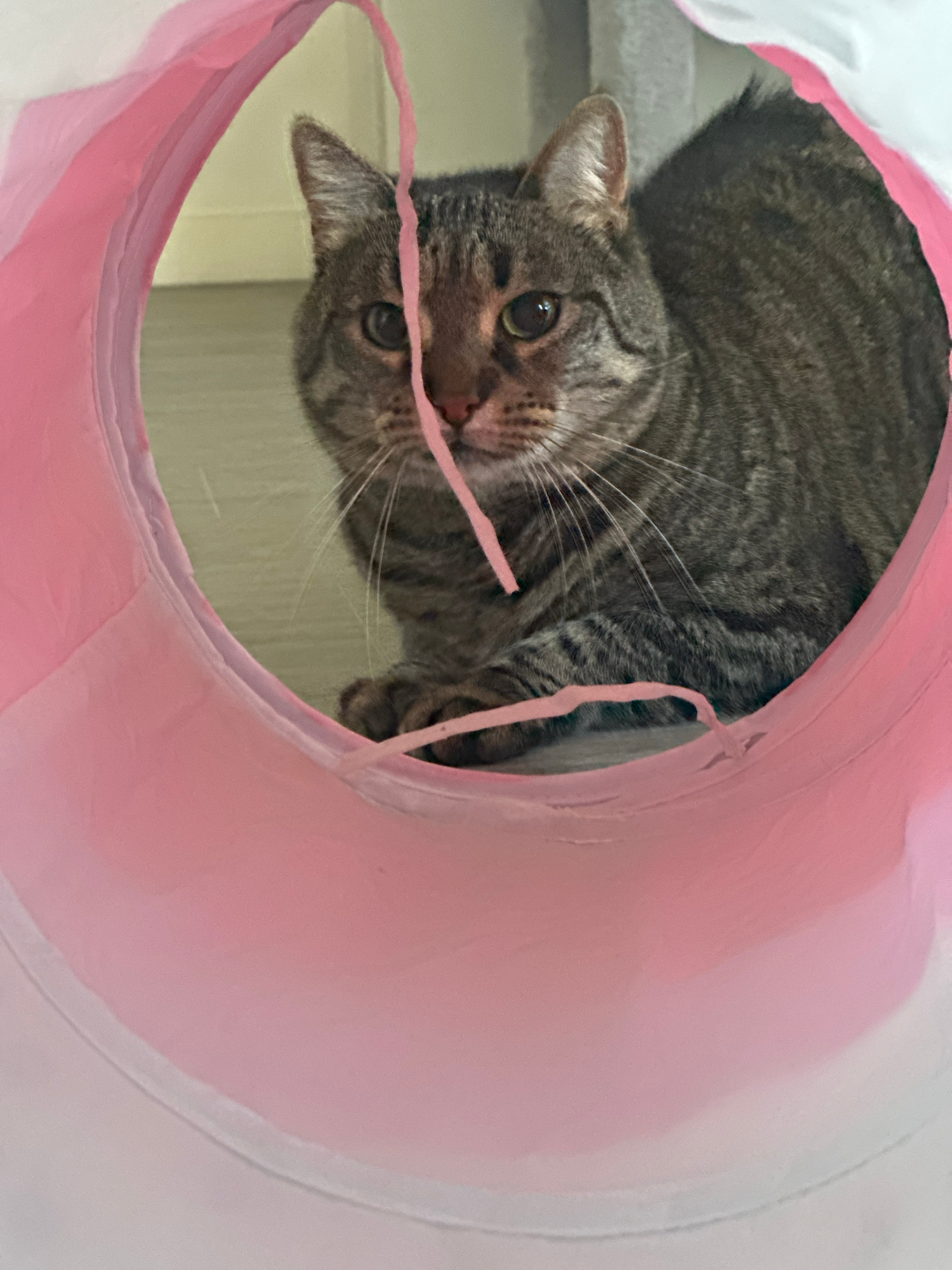 A tabby cat is captured in a close-up, eye-level shot, peeking out from within a pink, cylindrical play tunnel. The cat, with its distinctive gray and brown striped fur, has its head slightly tilted,…read more