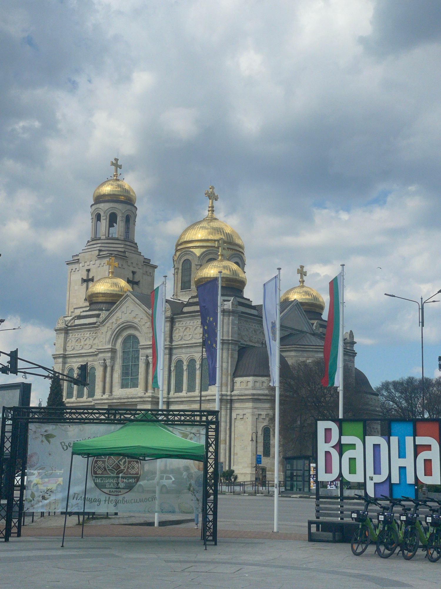 The image shows the Cathedral of the Assumption of the Virgin in Varna, Bulgaria. The cathedral is a large, ornate building with multiple golden domes topped with crosses. Several flags are flying nea…read more