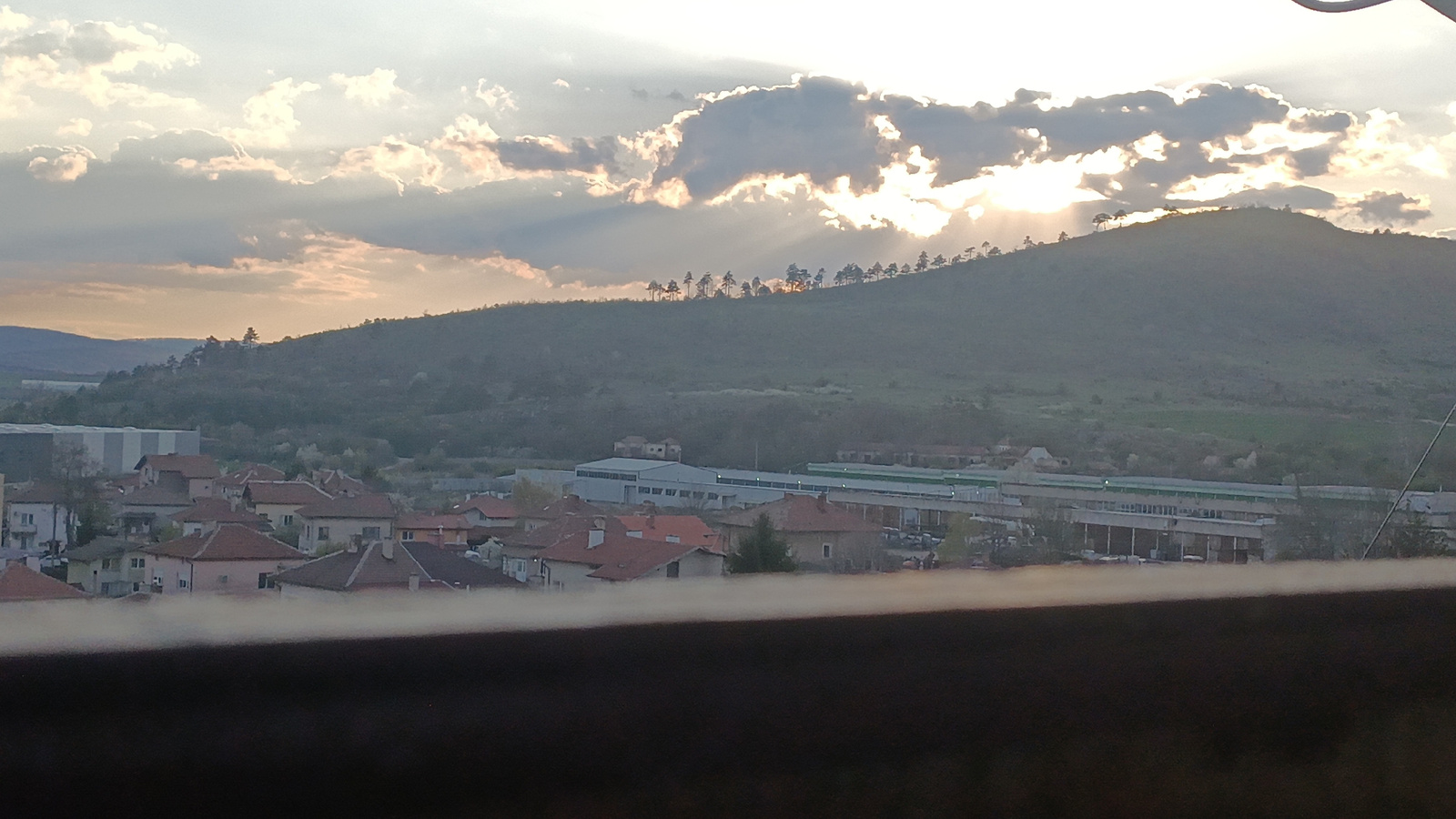 The image captures an elevated, panoramic view of a town, identified as Slivnitsa, Bulgaria, during sunset or late afternoon. The foreground is partially obscured by a dark, out-of-focus railing or le…read more