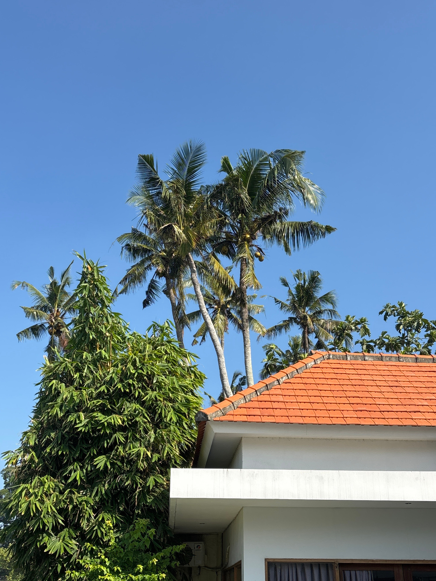 The image shows a view of a tropical scene, likely in Cemagi, Indonesia. The sky is clear and blue. Several palm trees with coconuts are visible against the sky. Part of a building with a red tile roo…read more