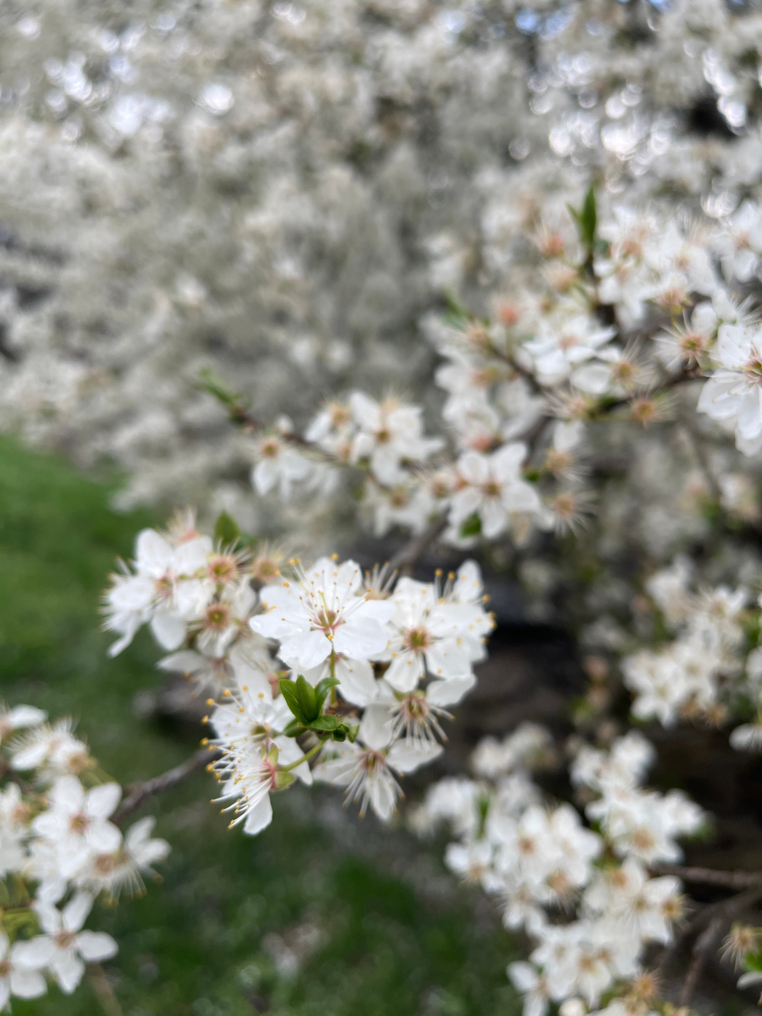 The image shows a close-up of white cherry blossoms on a branch, with more blossoms visible in the blurred background. The blossoms are small and five-petaled with long, prominent stamens. Some smallβ¦read more