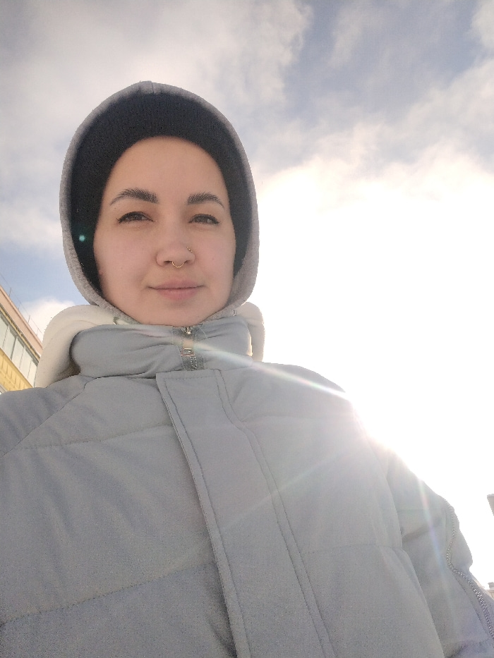 The image is a bright, upward-angled outdoor selfie or close-up portrait featuring a person, likely female. She is positioned towards the left side of the frame, looking directly at the camera with aβ¦read more