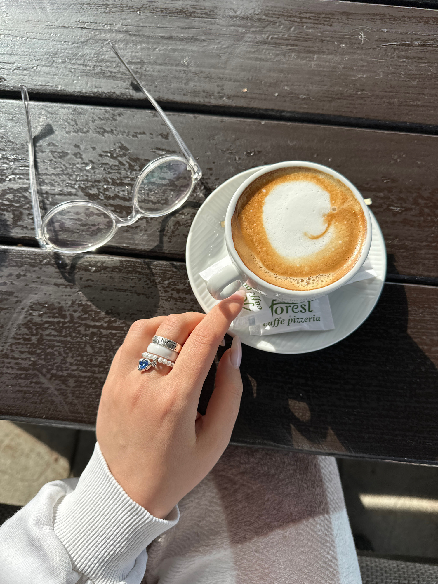 A close-up shot captures a moment at an outdoor café, likely in Bar, Montenegro, evidenced by the "forest caffe pizzeria" sugar packet. A cup of cappuccino with a frothy heart design sits on a white s…read more