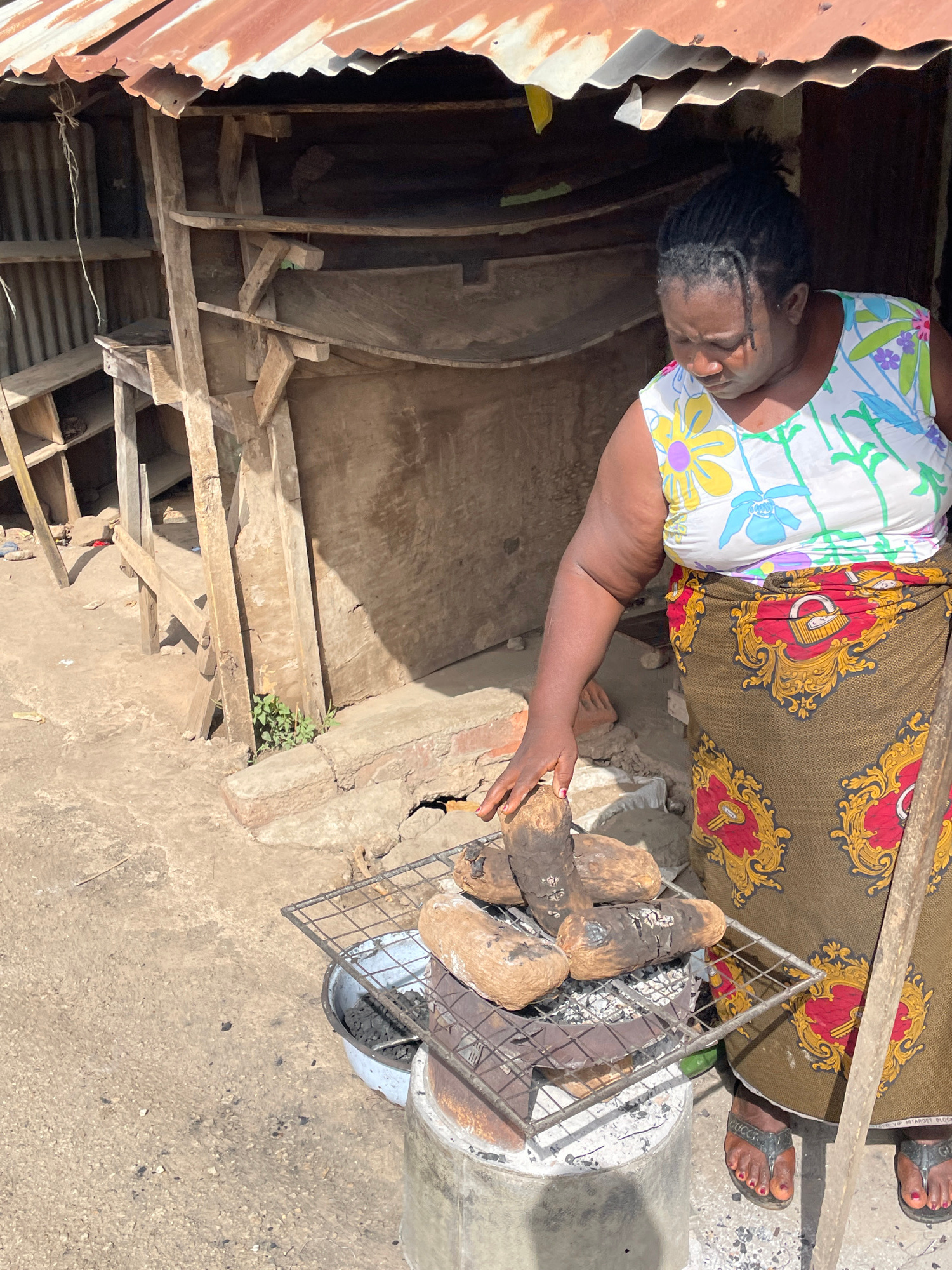 A woman is captured from an overhead perspective, cooking root vegetables on a charcoal grill outdoors or in a semi-enclosed space. She is wearing a white floral-patterned top and a dark wrapper with…read more