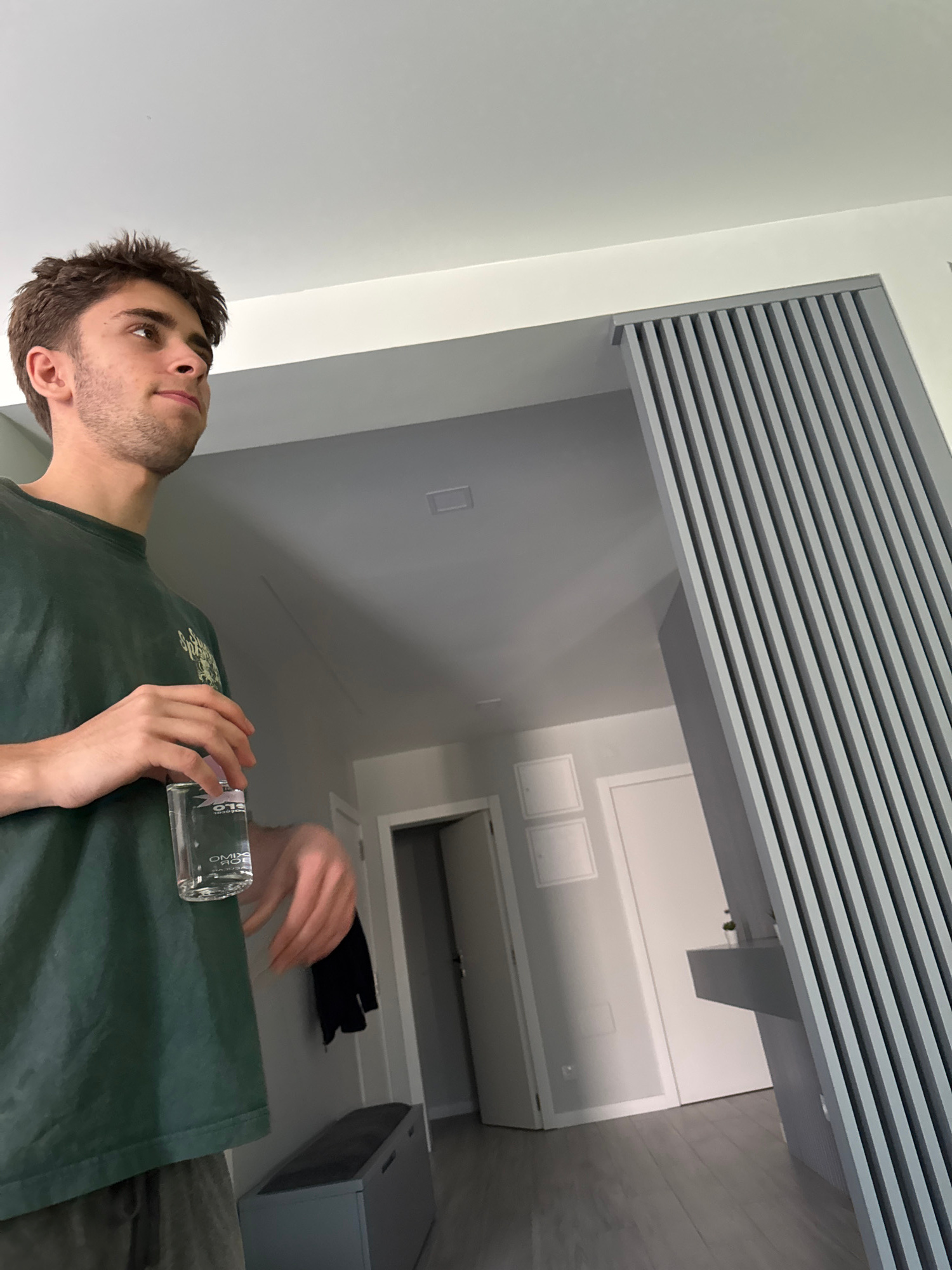 A man stands in a modern interior, possibly in Mirandela, Portugal. He holds a glass vial of clear liquid in his hands. In the background, there is a white door and a gray device on the floor. The cei…read more