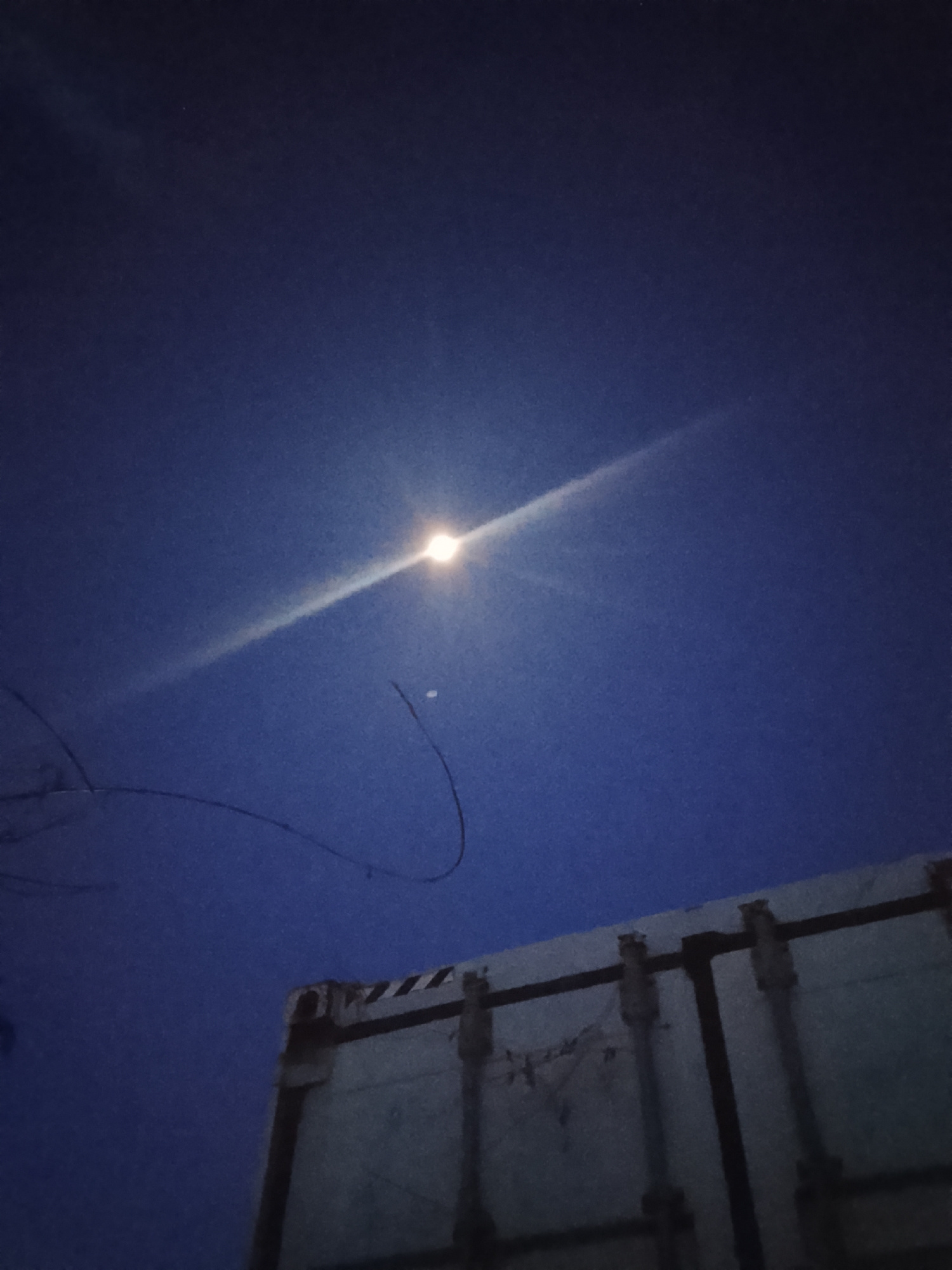 The image shows a night scene in Altagracia, Venezuela. The sky is dark blue with a bright light source, possibly the moon, emitting a radiant beam. A faint object is visible near the moon. In the for…read more