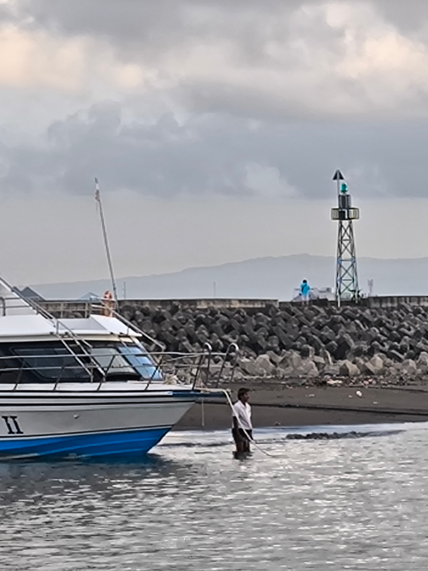 The image shows a scene at the Benoa Harbour in Denpasar, Indonesia. A white and blue boat, partially visible, is in the water on the left. A person is standing in the water, holding what appears to b…read more