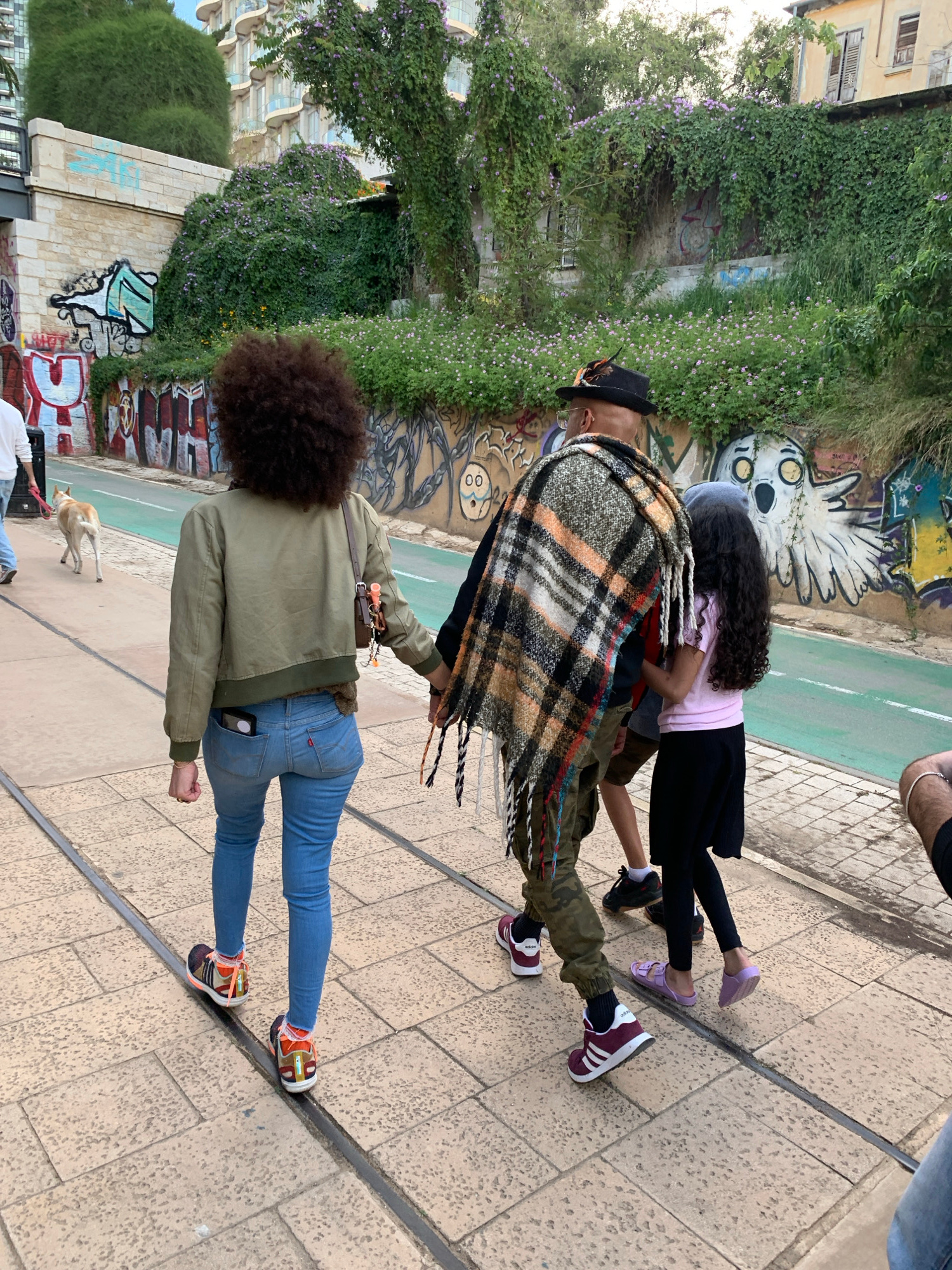 In Tel Aviv, Israel, a group walks on a sidewalk beside a street with graffiti-covered walls. A woman with an afro, wearing a green jacket and blue jeans, is walking to the left of the frame. A man we…read more