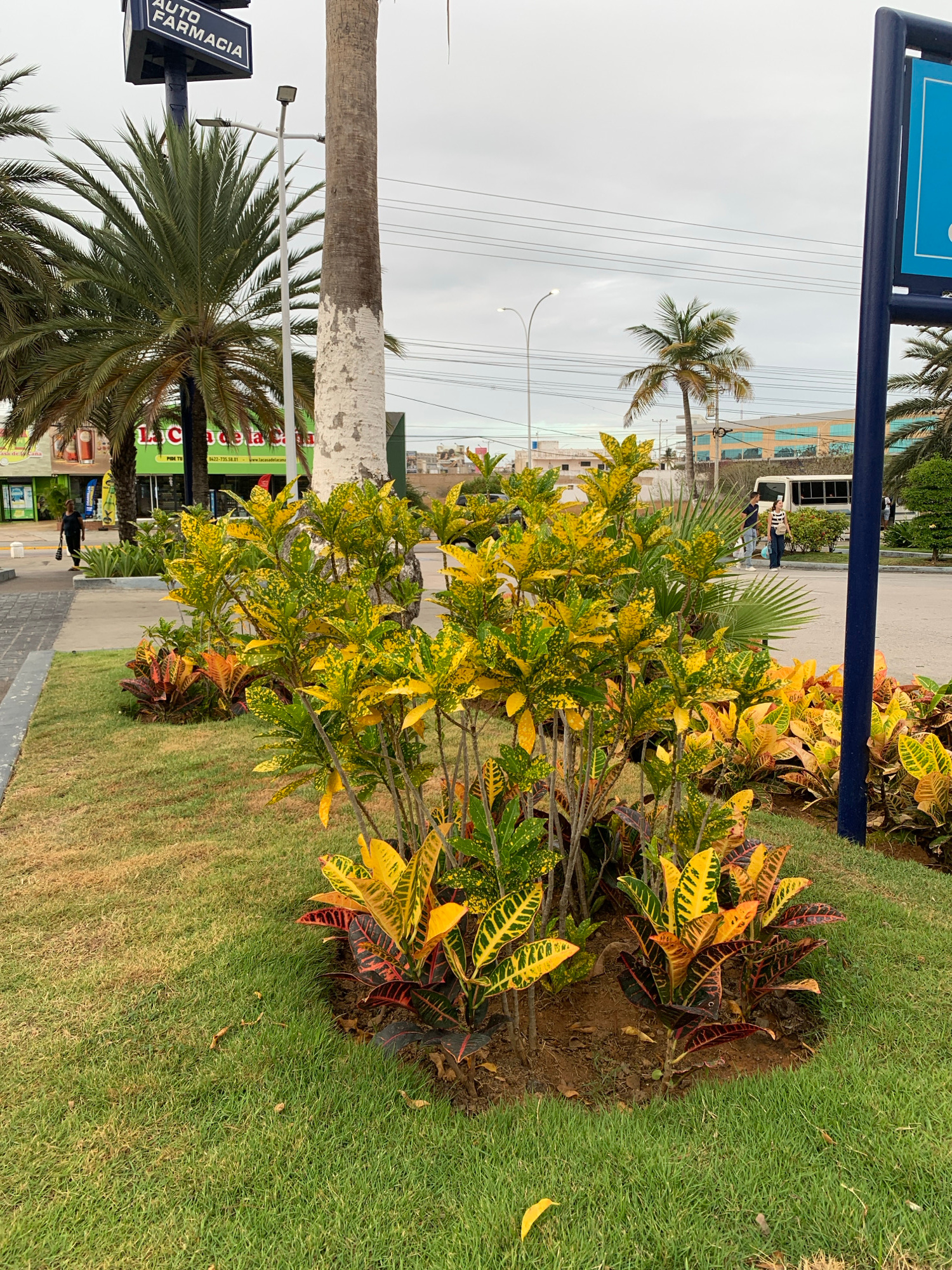 The image depicts a street scene in Pampatar, Venezuela, featuring tropical vegetation and infrastructure. **Subjects and Objects:** * **Vegetation:** Lush green grass, a cluster of colorful croton…read more
