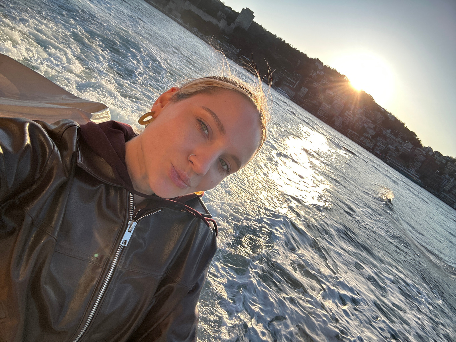 A woman is taking a selfie on a boat in Sarıyer, Turkey, with the sun setting behind the buildings on the shore. She is wearing a brown leather jacket over a burgundy top, and an earring in her left e…read more