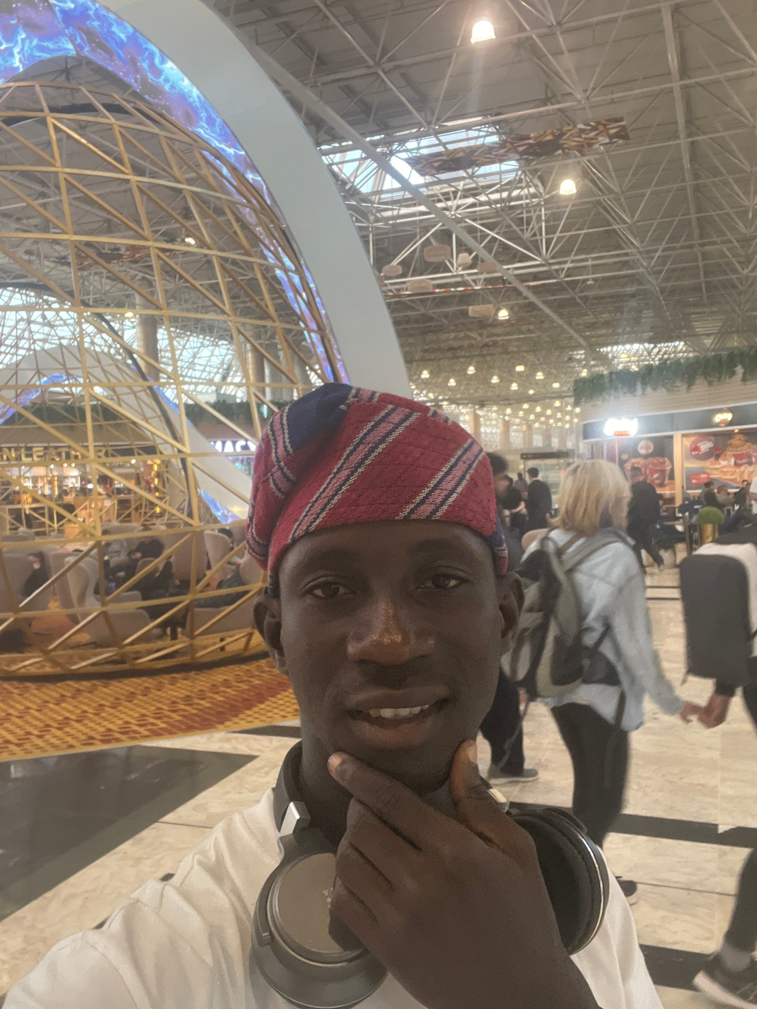 The image captures a person wearing a red and blue striped head covering, a white shirt, and headphones around their neck. They are smiling and touching their face with one hand. The background revealβ¦read more
