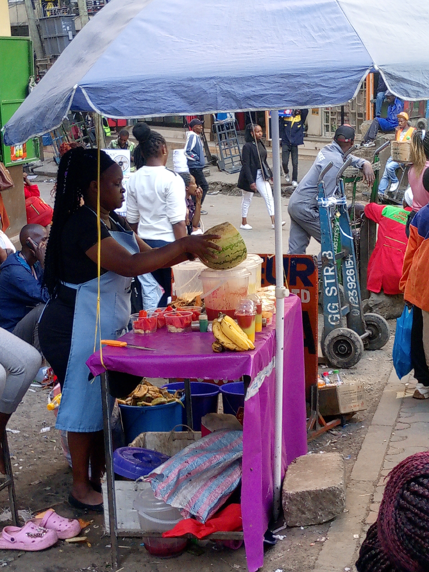 The image depicts a street scene in Nairobi, Kenya. A woman wearing a blue apron stands behind a table covered with a purple cloth. She is holding a watermelon. On the table are containers of fruit, a…read more