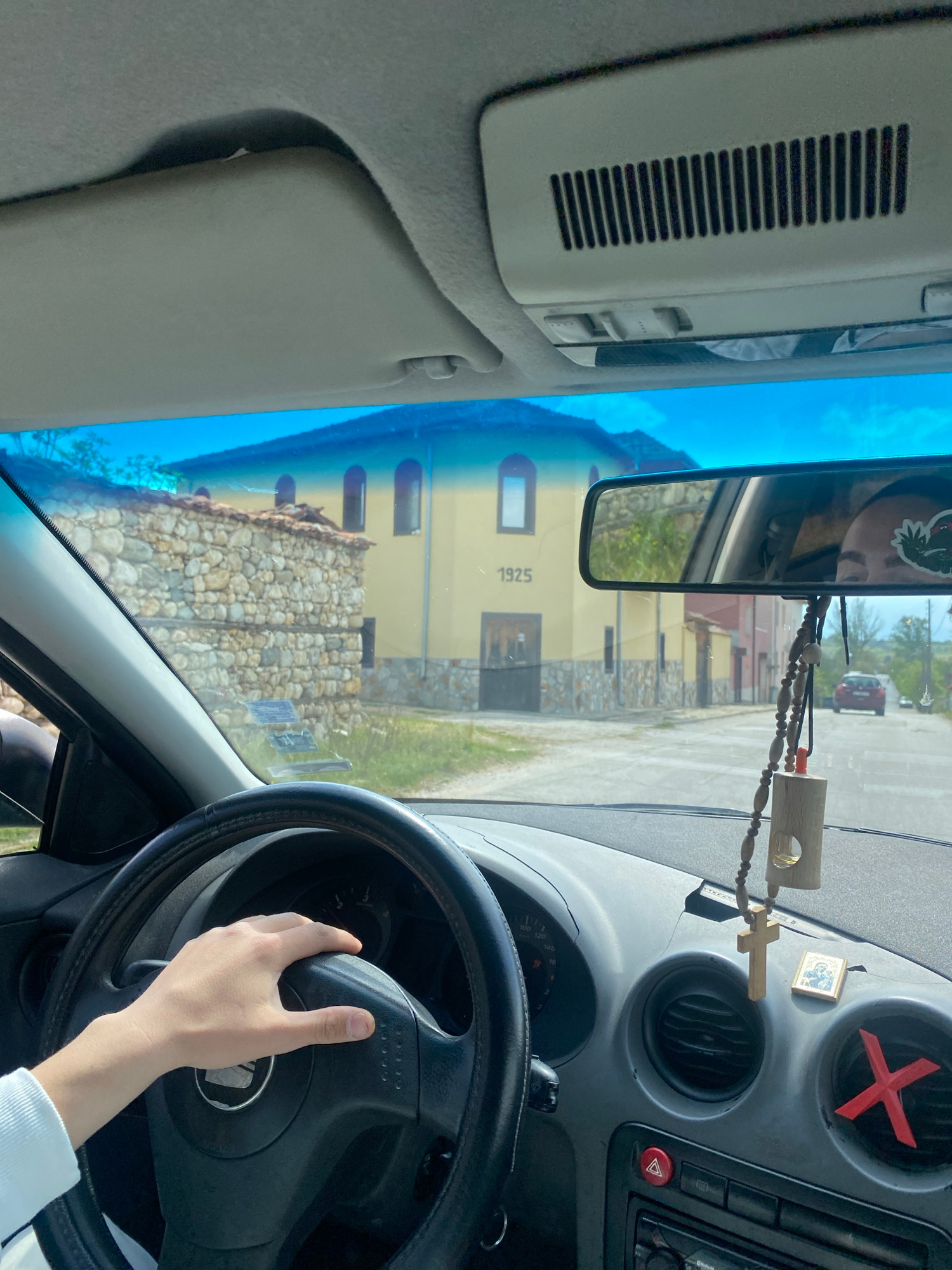 The view from inside a car, with a hand on the steering wheel. The car is on a street in Kapatovo, Bulgaria, facing a two-story building. "1925" is visible on the building's facade. A rear-view mirror…read more