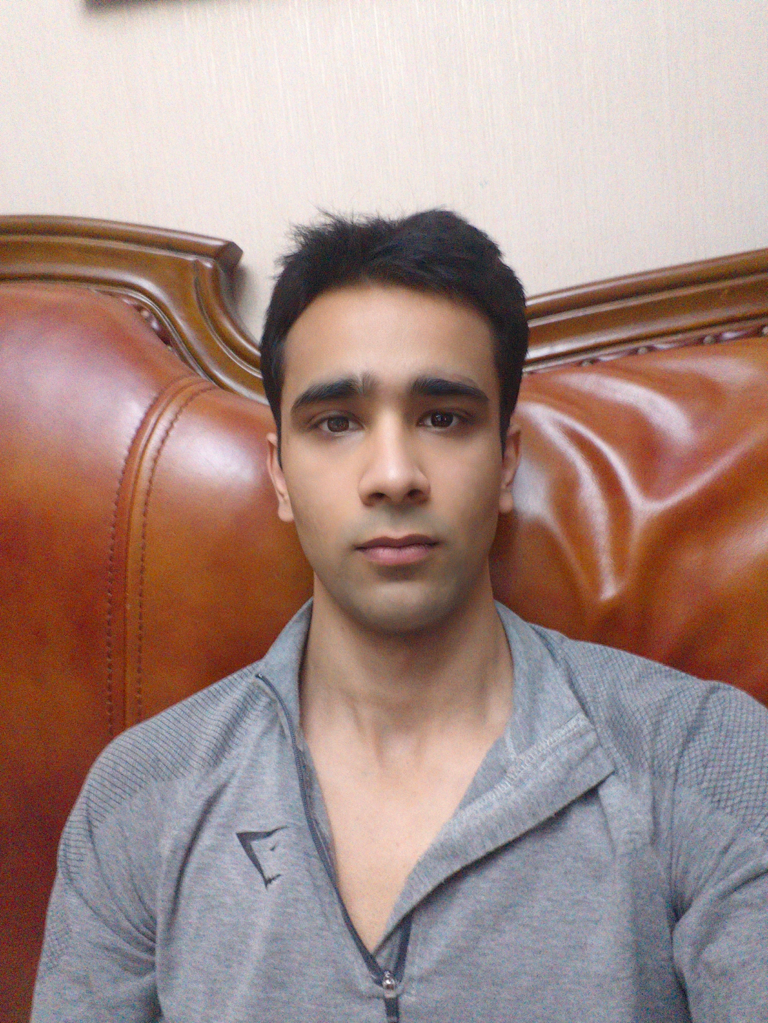 A man with dark hair and brown eyes is seated in a brown leather chair. He is wearing a grey zip-up shirt with a small logo on the left side. The background is a plain, light-colored wall. There is no…read more