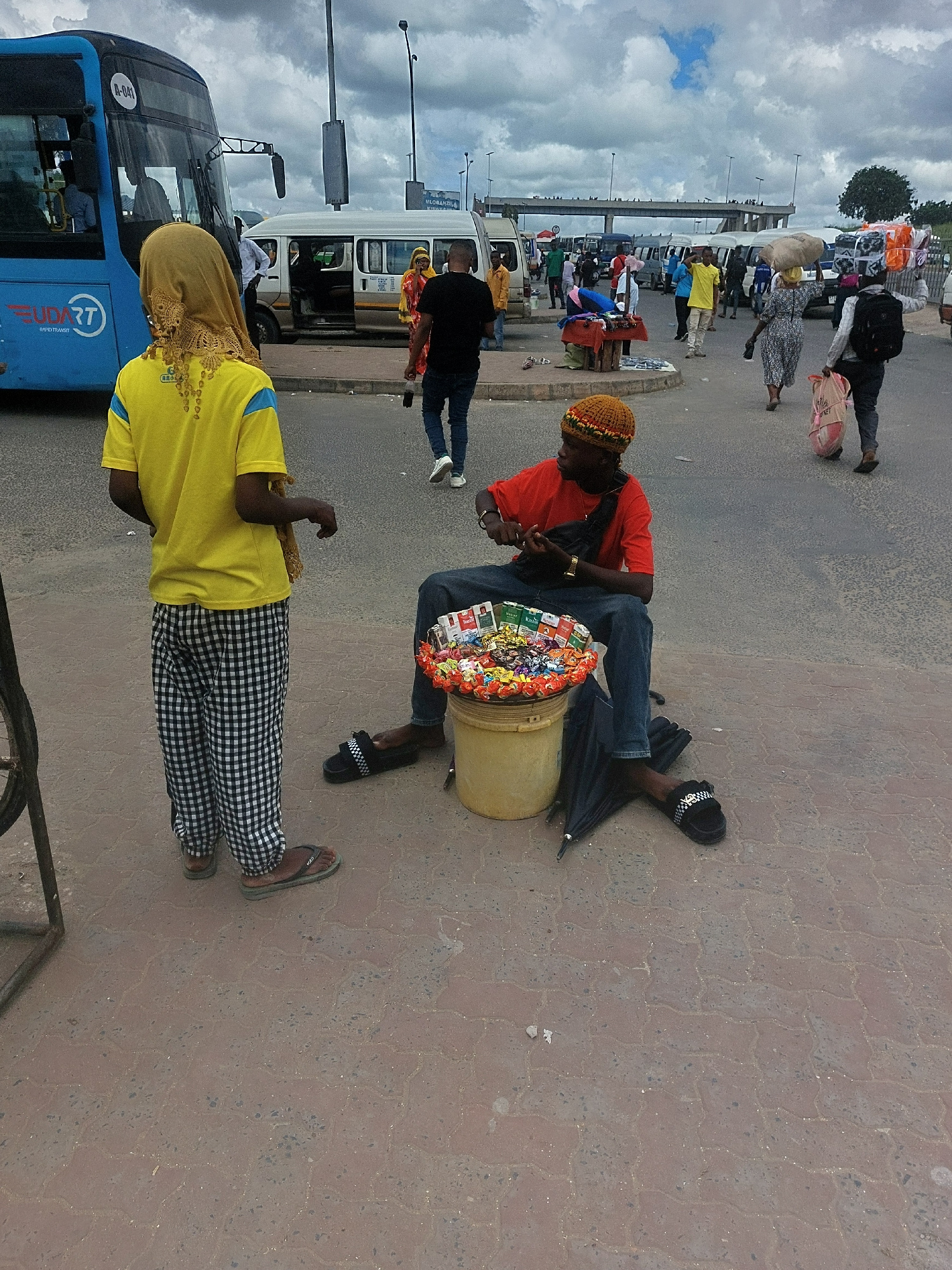 The image depicts a street scene in Dar es-Salaam, Tanzania. A man wearing a yellow and orange beanie, a red t-shirt, and blue jeans is sitting on the ground, with a bucket filled with candy and cigar…read more