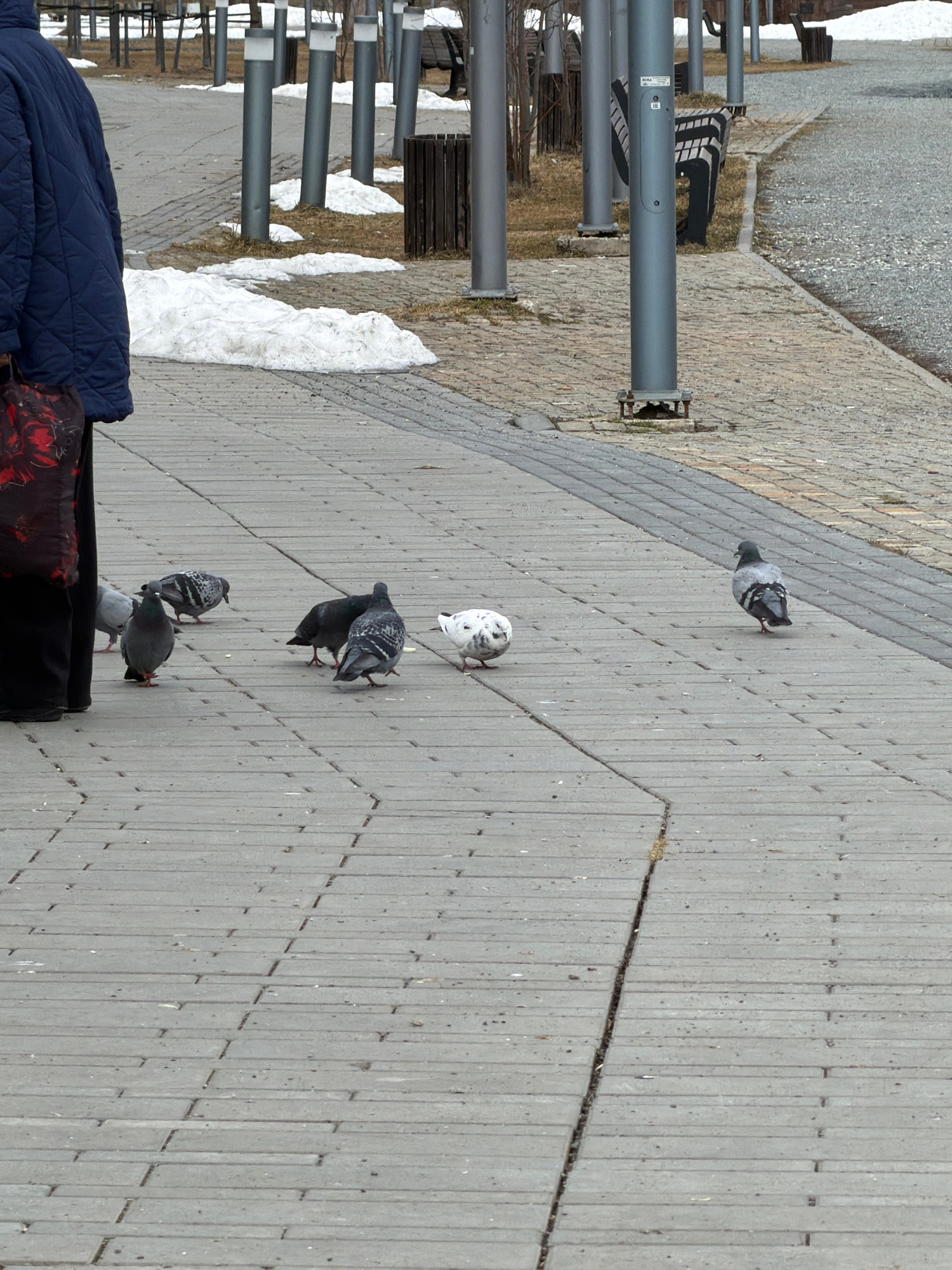 The image depicts a paved walkway in Votkinsk, Russia, likely a public area. Several pigeons are scattered on the walkway, some near a blue quilted blanket and a patterned bag on the lower left. Metal…read more