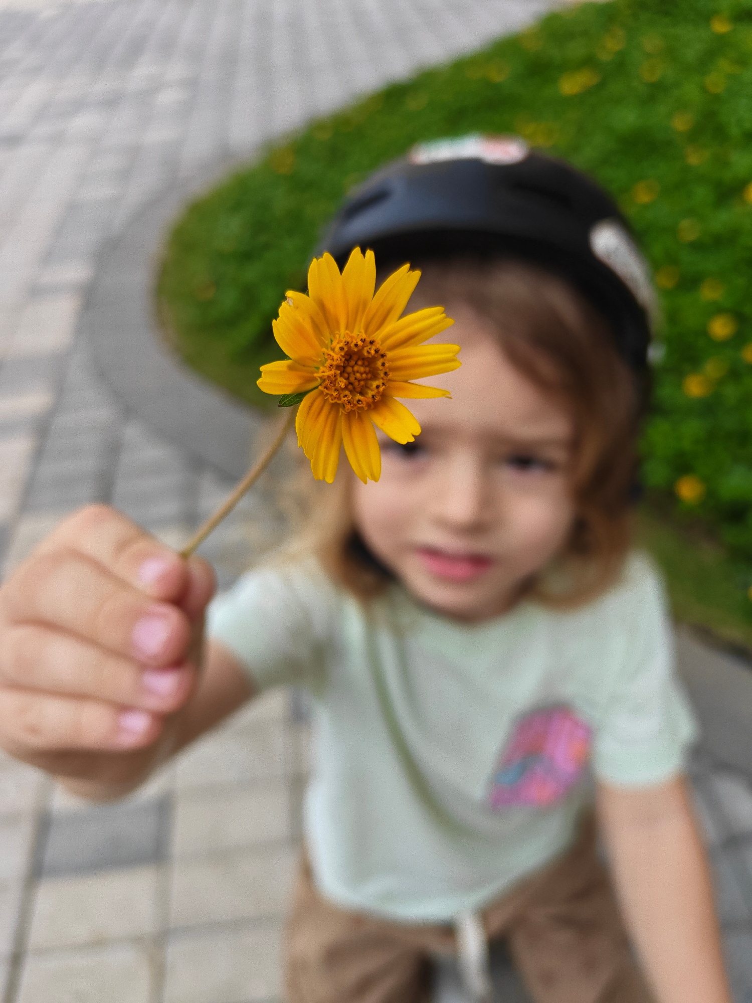 A close-up photograph with a shallow depth of field captures a young child holding out a single bright yellow flower. The flower, featuring numerous vibrant yellow petals around a prominent orange-bro…read more