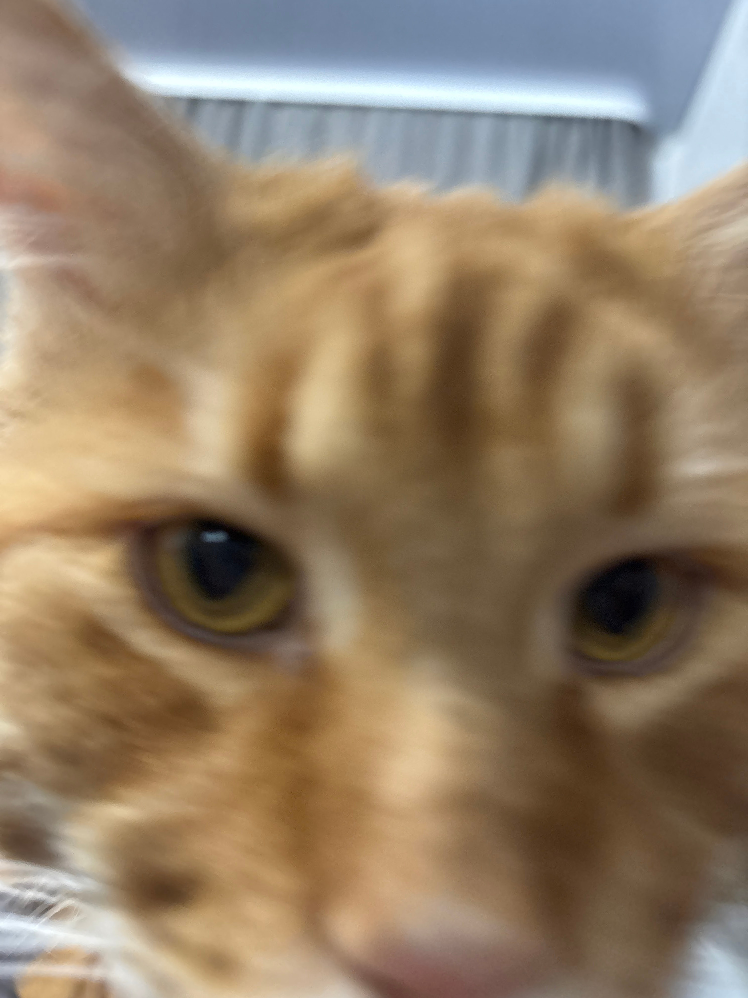 The image shows a close-up, slightly blurred view of an orange cat's face. The cat's eyes are the most prominent features, with visible black pupils and yellow irises. The cat's fur is orange and appe…read more