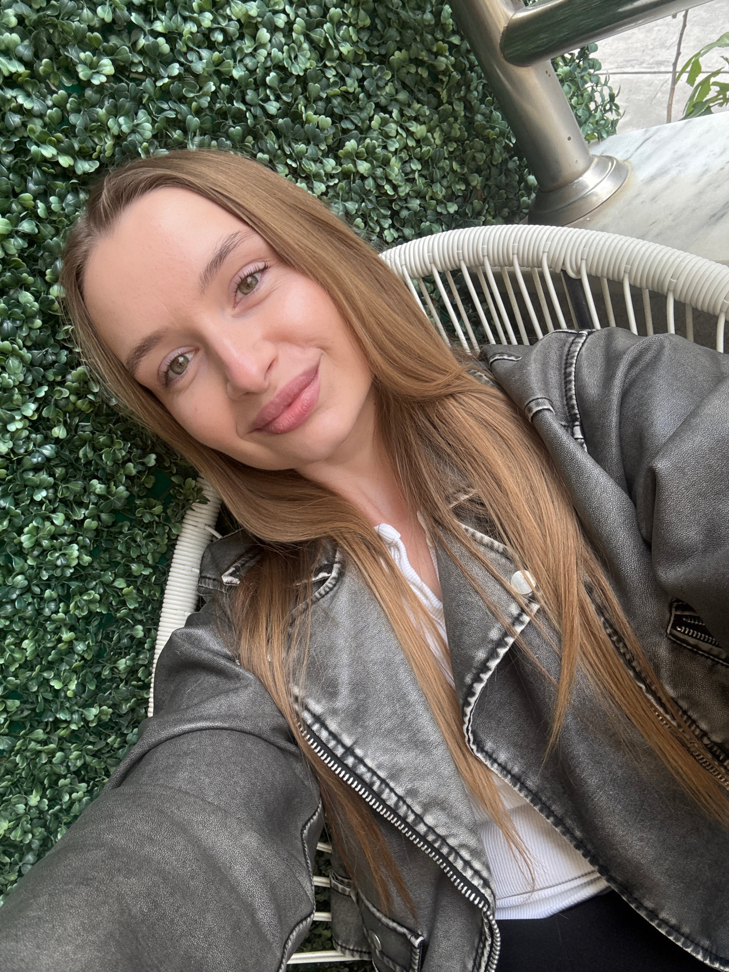 A fair-skinned woman with light brown hair poses for a photo while seated in a white wicker chair. She is wearing a gray leather jacket over a white top. The chair is placed on a green artificial foliβ¦read more