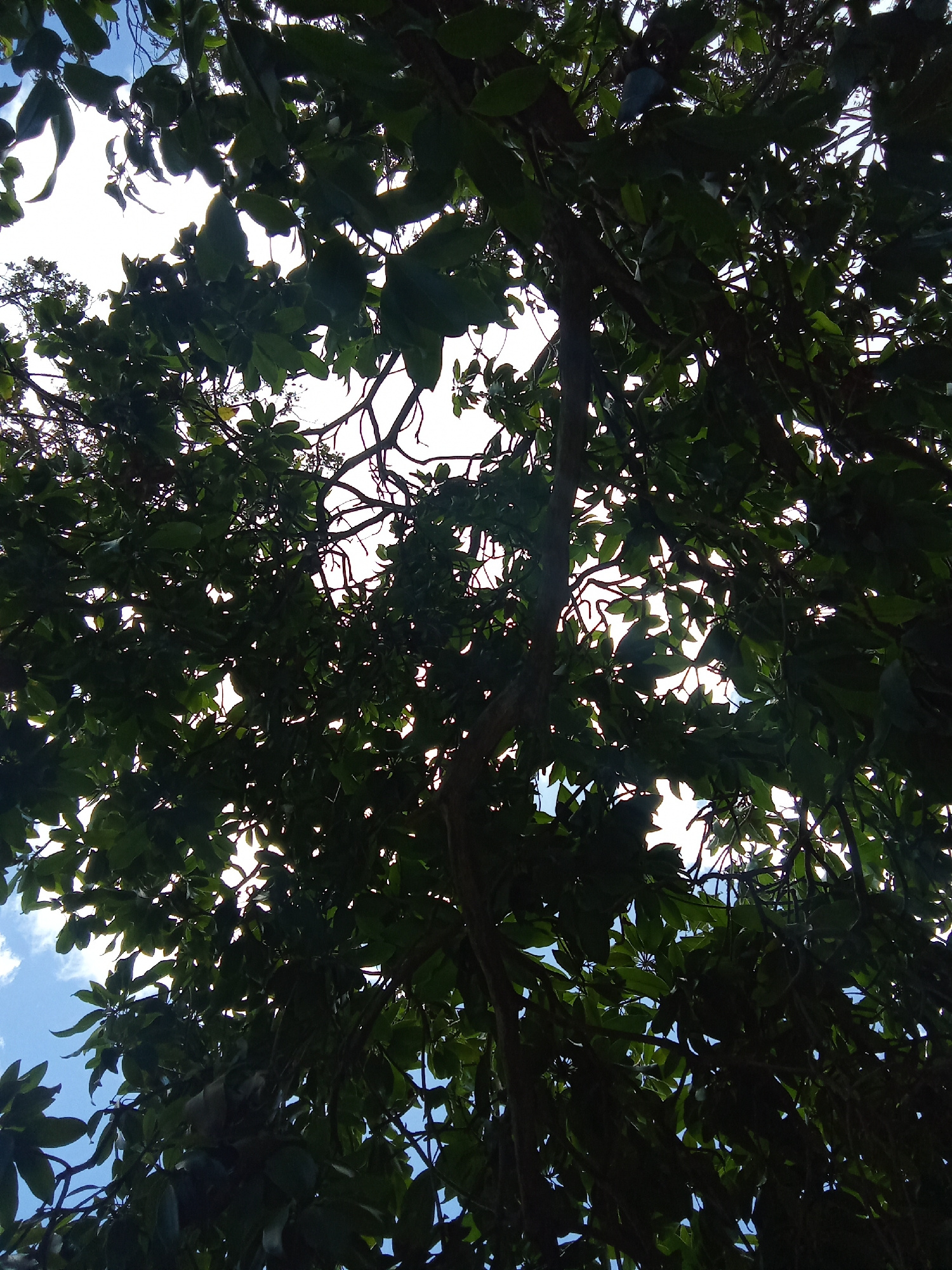 Looking up into the canopy of a tree, leaves obscure the view of the sky, revealing glimpses of blue sky with white clouds. The tree is full and dense, and the sun shines brightly through the leaves.…read more