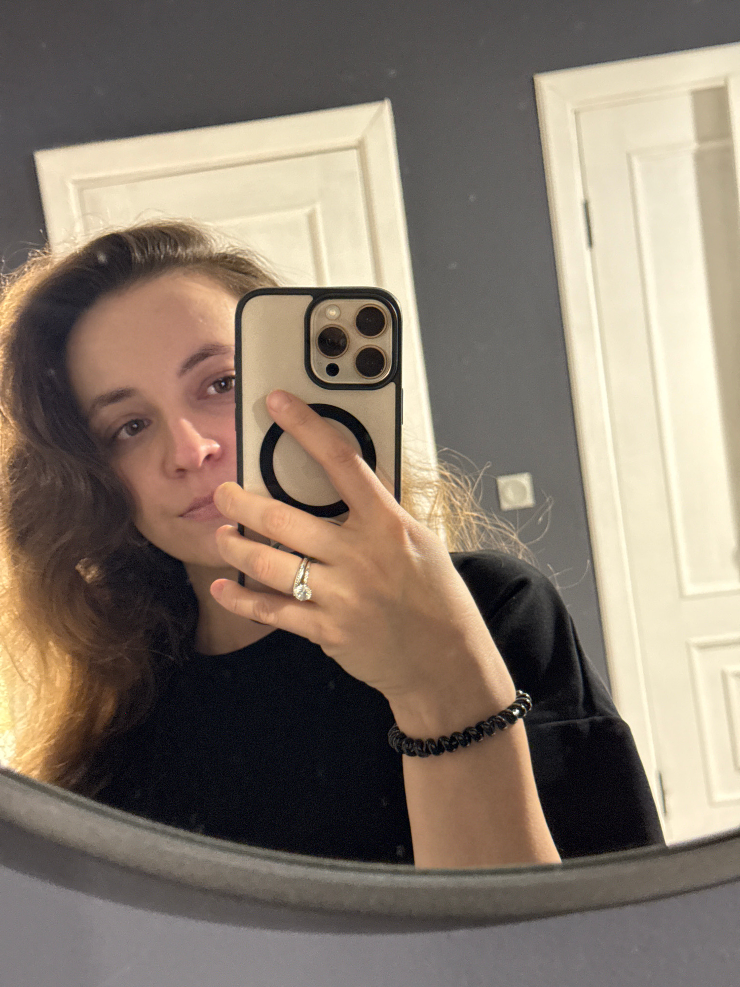 A mirror selfie captures a woman holding a smartphone, reflected in an oval or rectangular mirror. The image is oriented with the woman's head at the bottom, looking up towards the camera. She has lon…read more