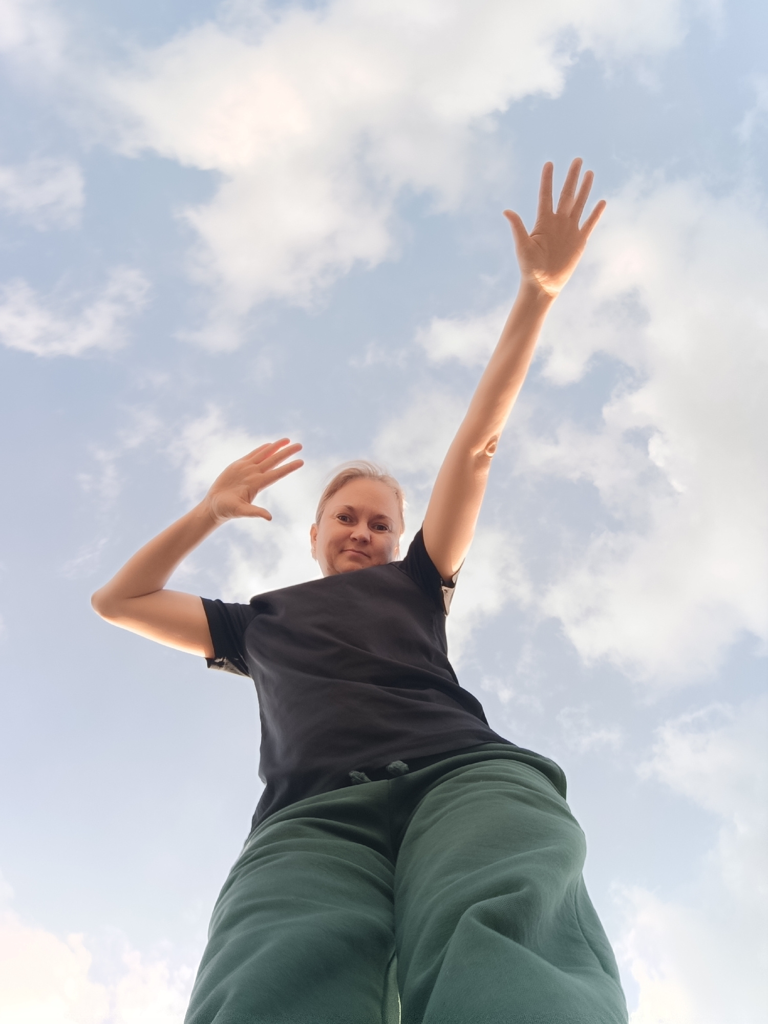 A woman with short blonde hair and fair skin stands looking directly at the camera. She wears a black t-shirt and green sweatpants. Both arms are raised, hands open and fingers spread as if waving. Thβ¦read more