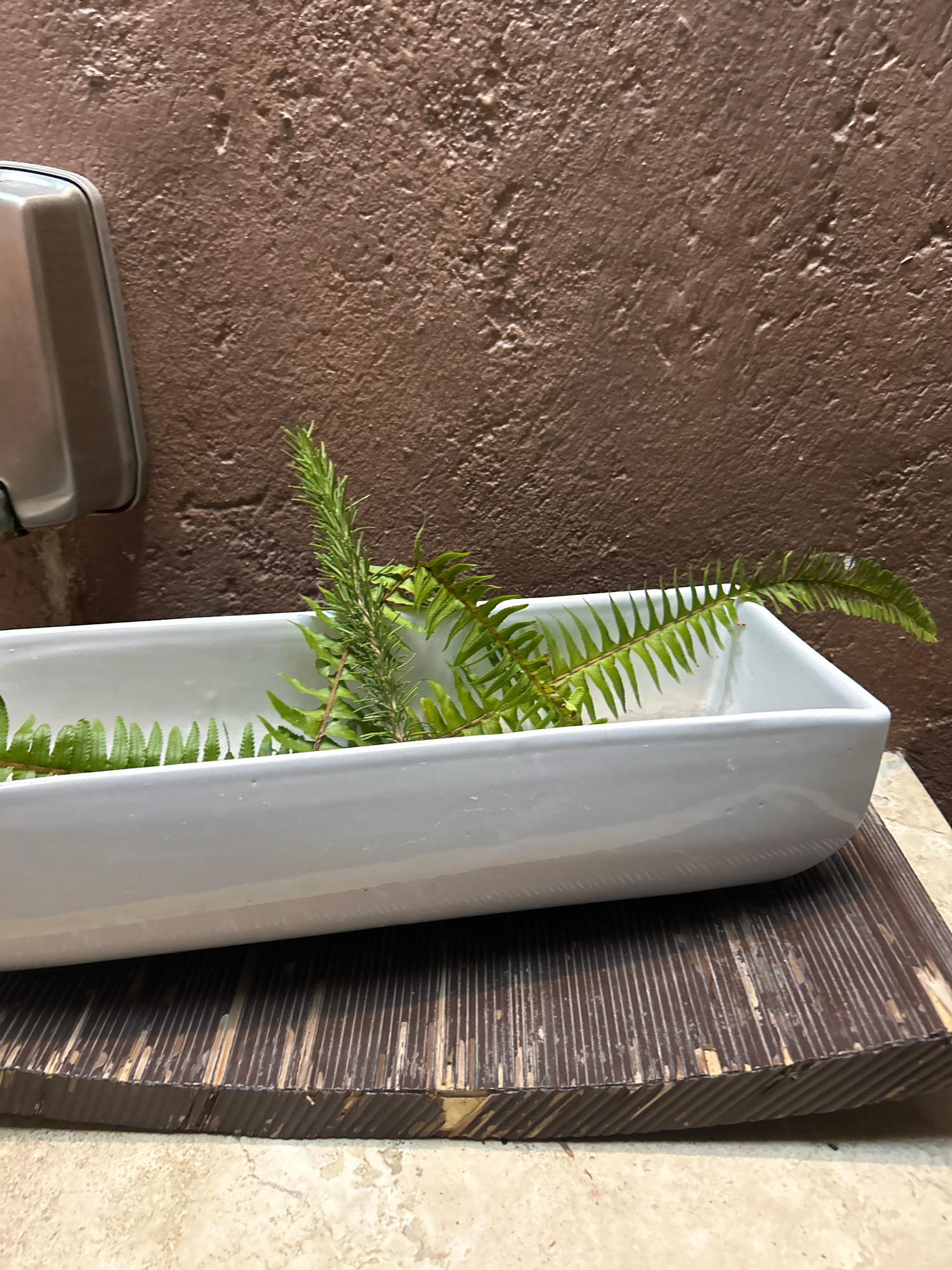 A medium shot captures a wall with a textured brown paint, a tall, white, rectangular planter filled with green ferns, and a framed piece of dark, striated wood leaning against a tiled wall. Below the…read more