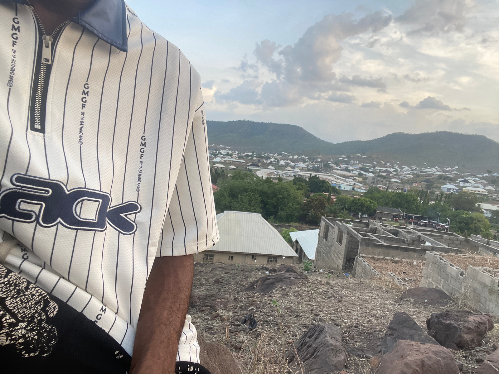 The image, if rotated to landscape orientation, captures an outdoor scene in Lokoja, Nigeria, from an elevated perspective. A person is partially visible in the foreground on the right, showcasing a d…read more