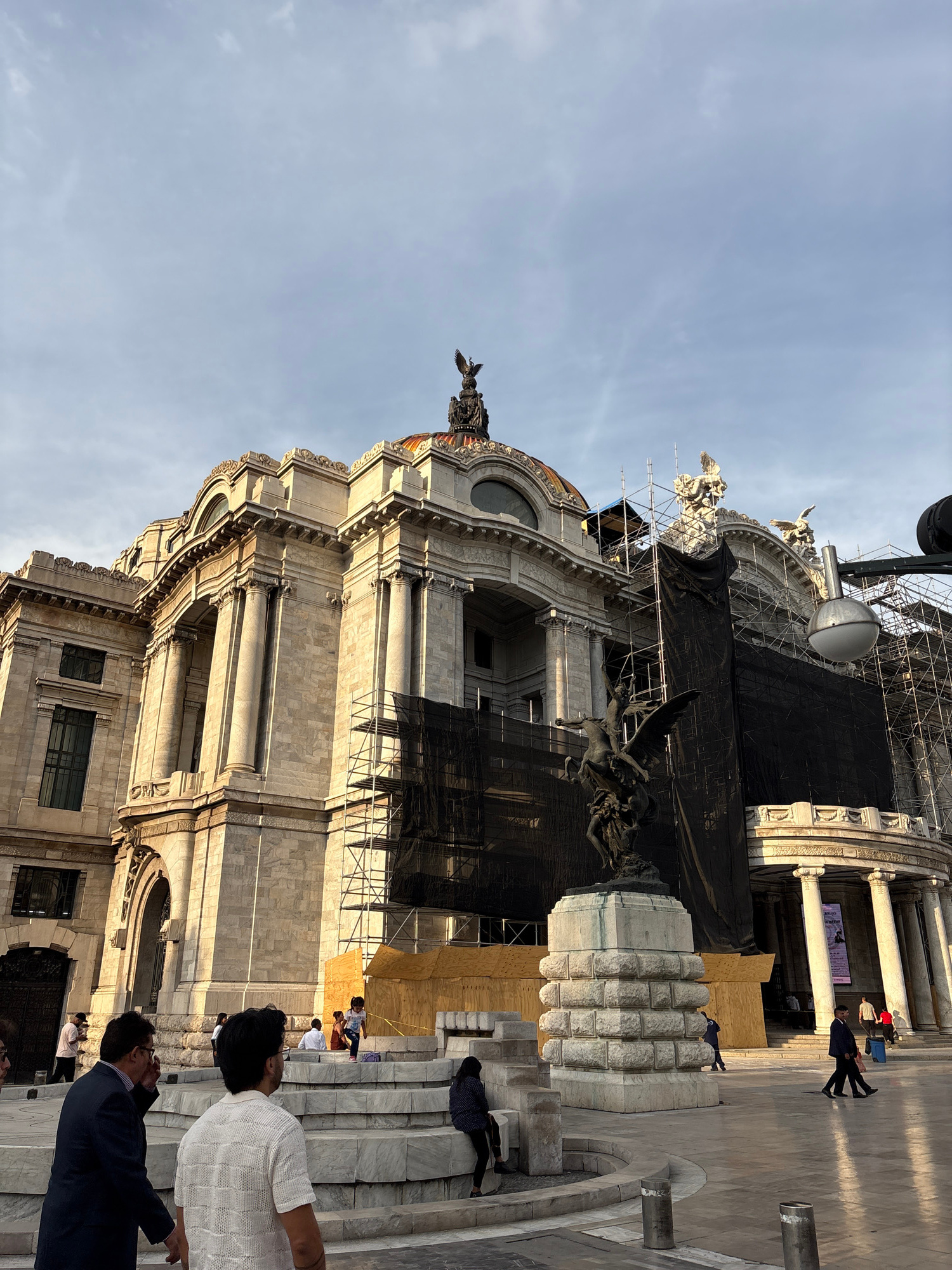 The image shows a partial view of the Palacio de Bellas Artes (Palace of Fine Arts) in Mexico City, Mexico. The palace is under renovation or construction, with black mesh coverings and scaffolding vi…read more