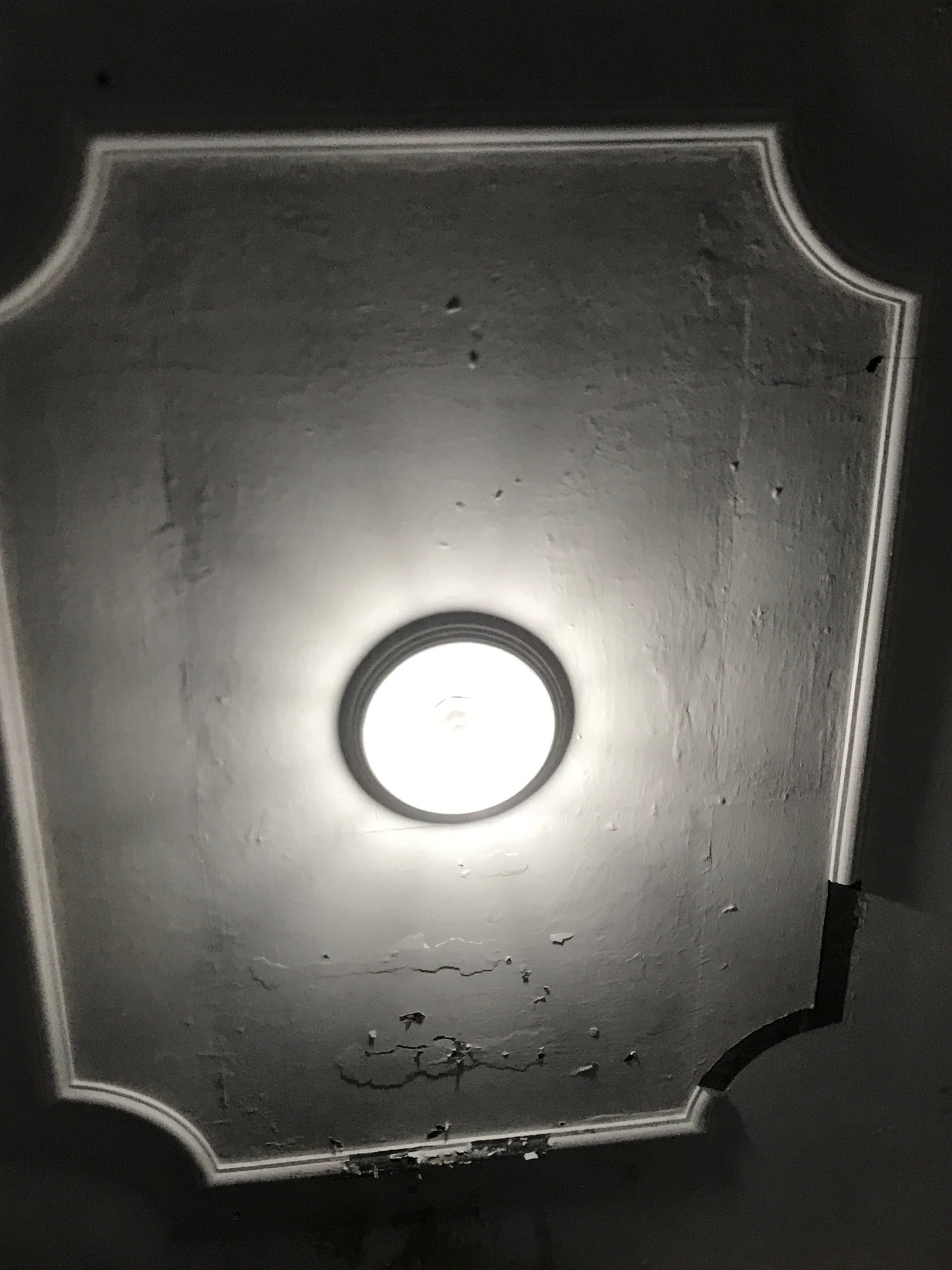 The image presents an overhead view of a ceiling, dominated by a centrally placed, circular light fixture. This light emanates a bright white glow, creating a distinct halo effect against the surround…read more