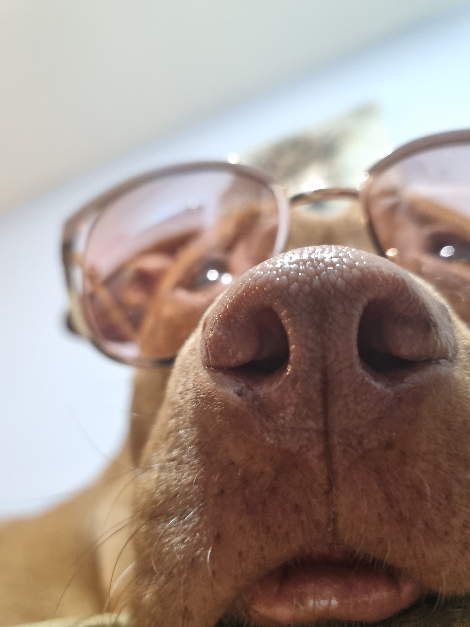 A close-up shot focuses on the nose of a dog wearing sunglasses. The dog is light brown in color and has a large, wet nose. The sunglasses are round and have a pink tint. The background is a blurred w…read more