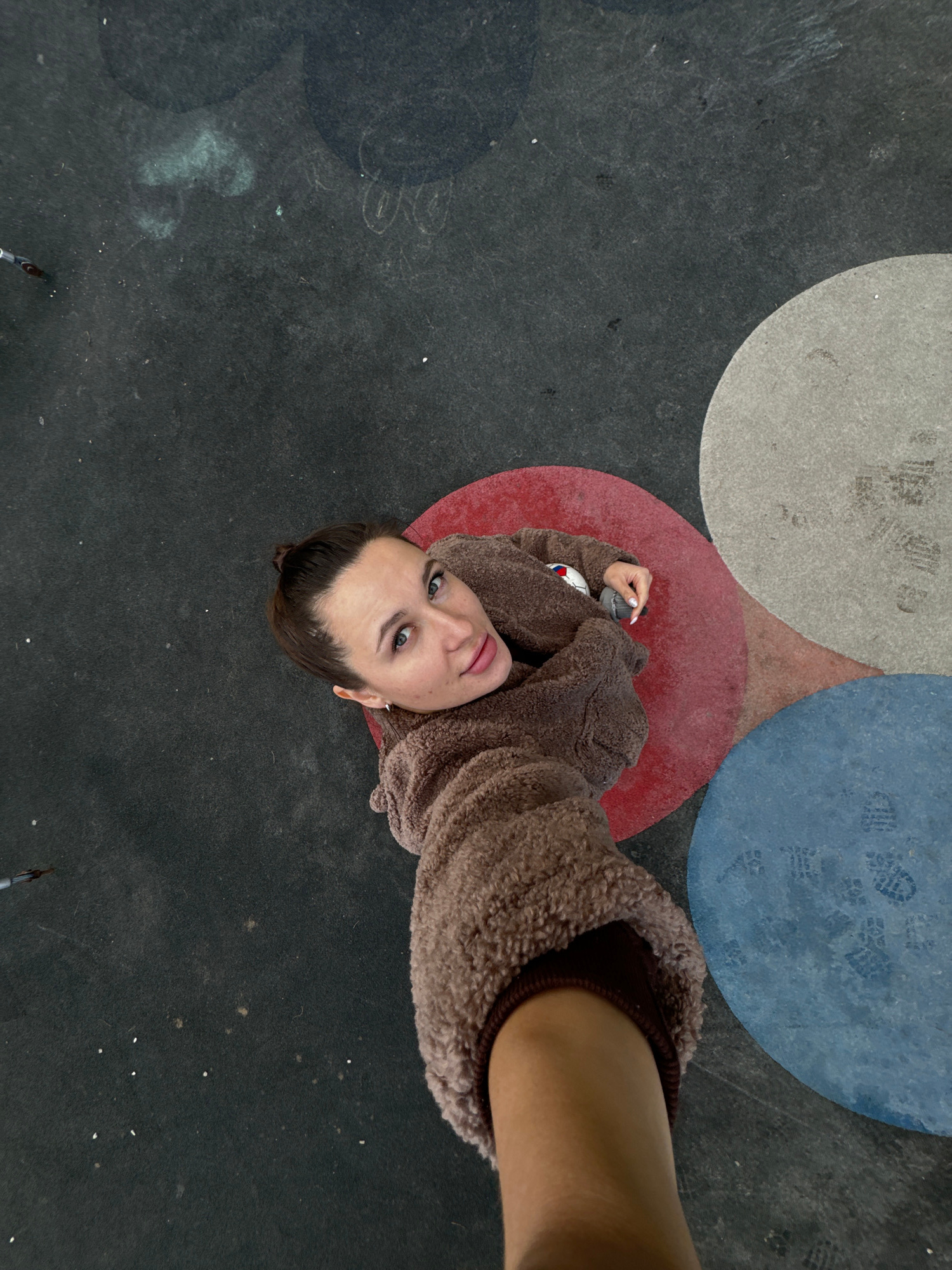 An overhead perspective captures a female individual from Odintsovo, Russia, positioned on a dark, rubberized ground surface featuring overlapping painted circles. The subject, a woman with brown hair…read more