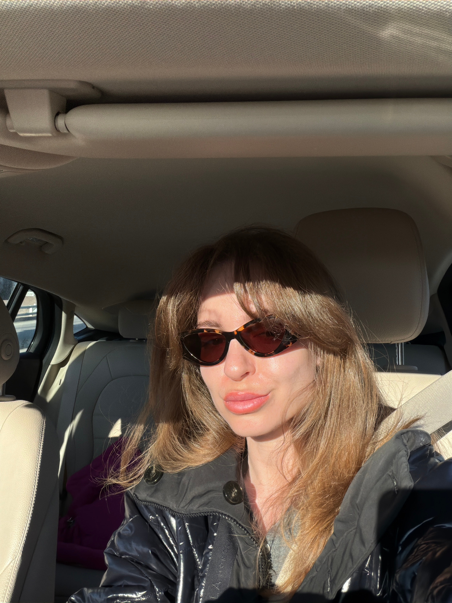 A woman with light brown hair, wearing sunglasses and a black puffer jacket, is in a car. The car's interior is light-colored. The image appears to be taken in direct sunlight. The location cannot be…read more