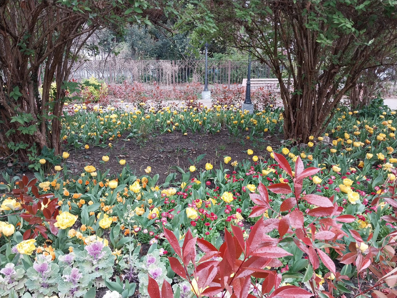 This image captures a vibrant and meticulously maintained garden or park scene, likely in Sochi, Russia. The view is framed by two large trees or dense bushes with brown, interwoven branches and spars…read more