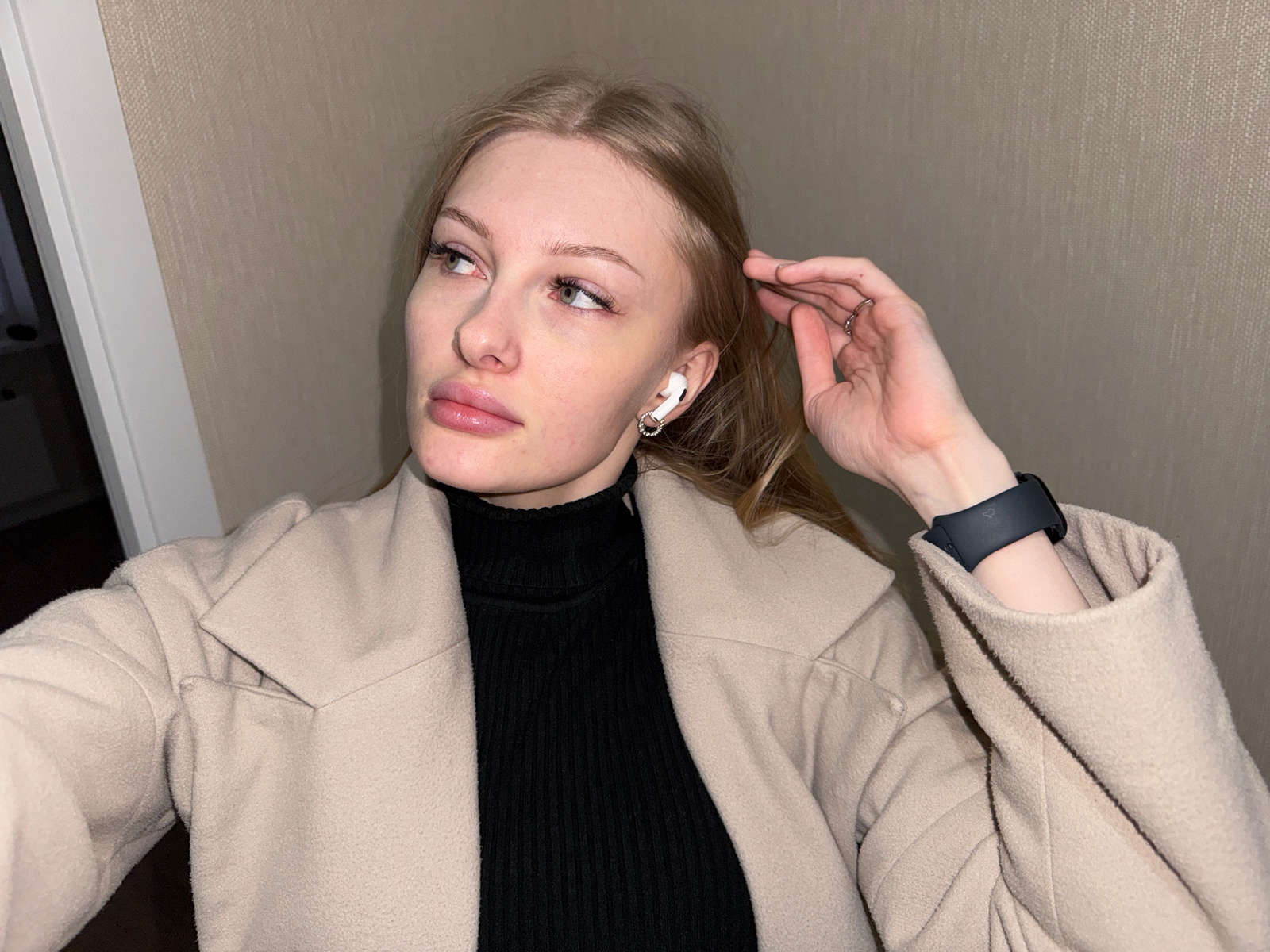 A young, fair-skinned woman with blonde hair is lying on her back. She is wearing a black turtleneck sweater and a beige coat. There is a black fitness tracker on her left wrist and a ring on the ring…read more