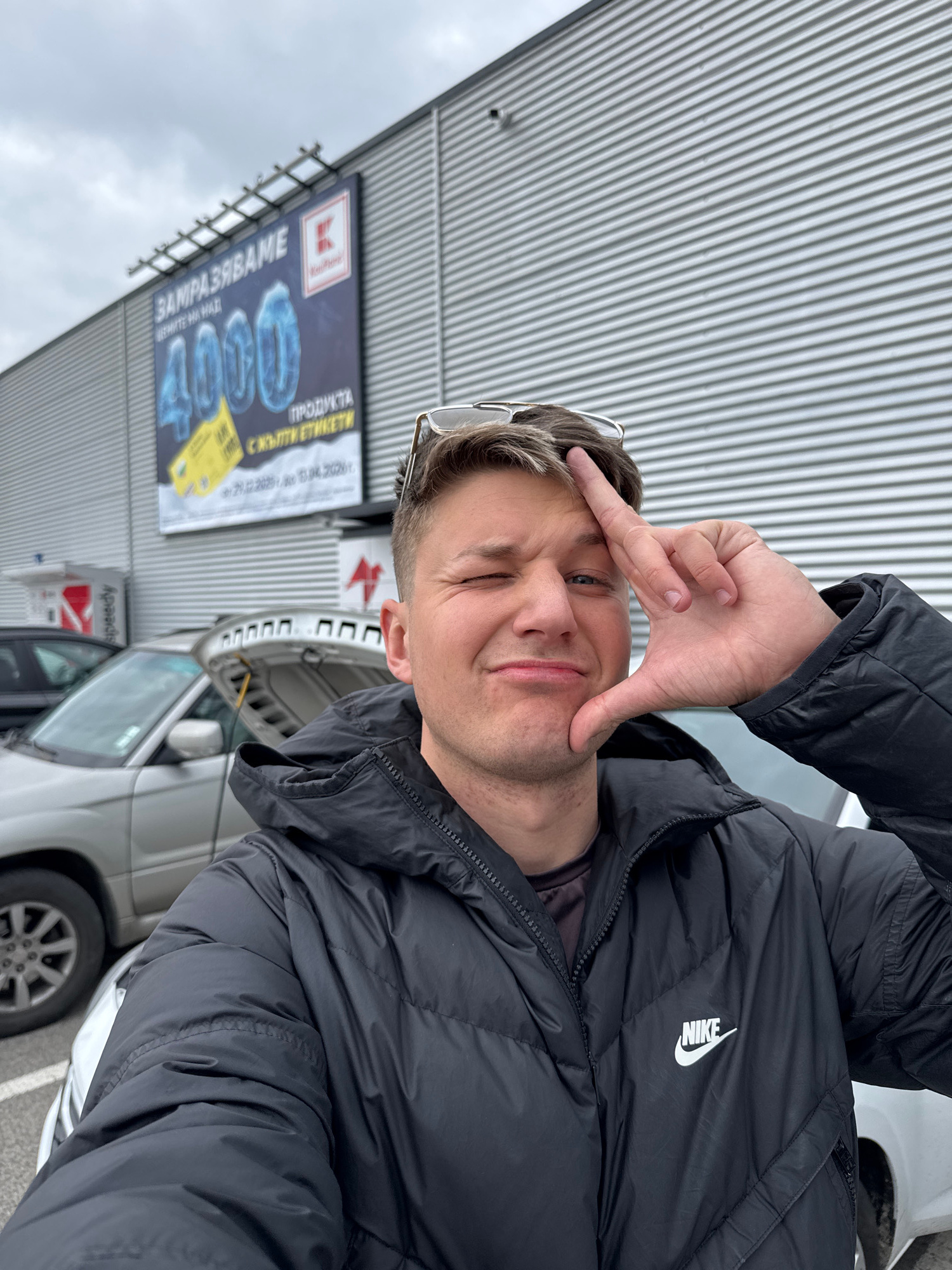 The image shows a man standing outside a building with a "Kaufland" advertisement in Burgas, Bulgaria. He is wearing a black Nike puffer jacket and glasses, and he is making a square with his hand nea…read more