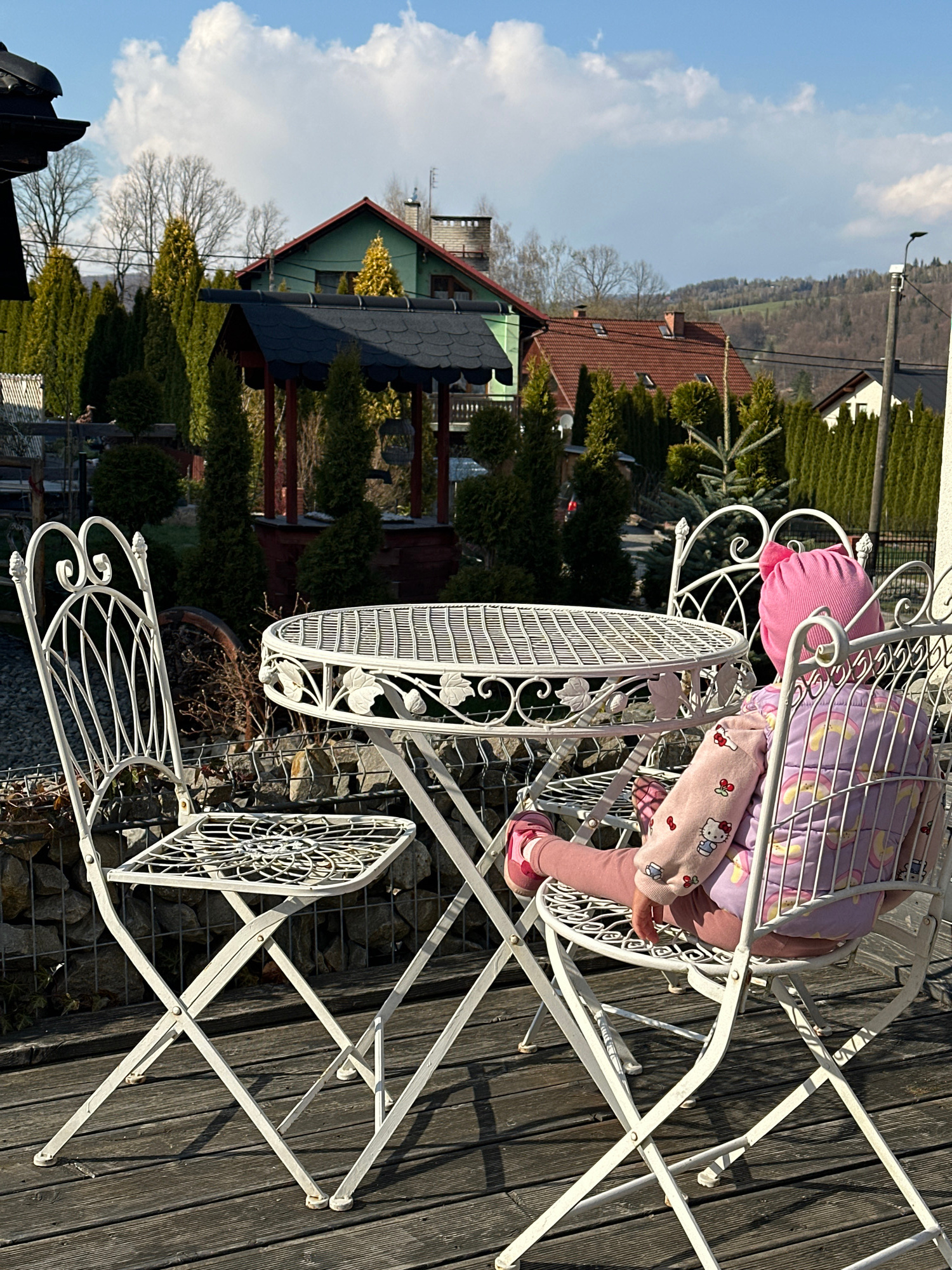 A young child wearing a pink beanie, a patterned purple jacket, and pink pants is sitting in a white metal chair at a table on a wooden deck. A second white metal chair is positioned at the table. The…read more