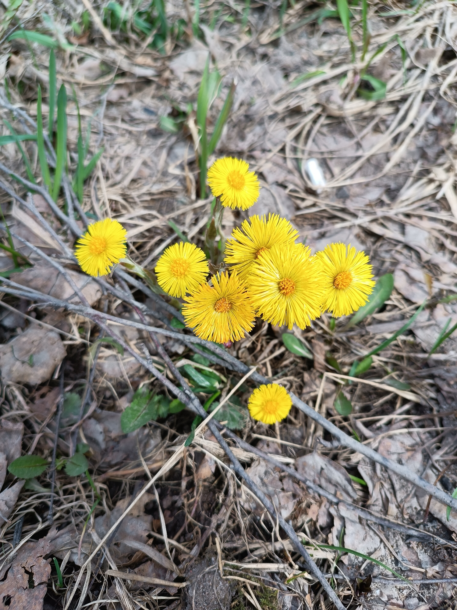The image shows a cluster of yellow flowers, likely Coltsfoot (Tussilago farfara), growing among dry leaves, twigs, and sparse green vegetation. The setting appears to be a natural area within an urba…read more