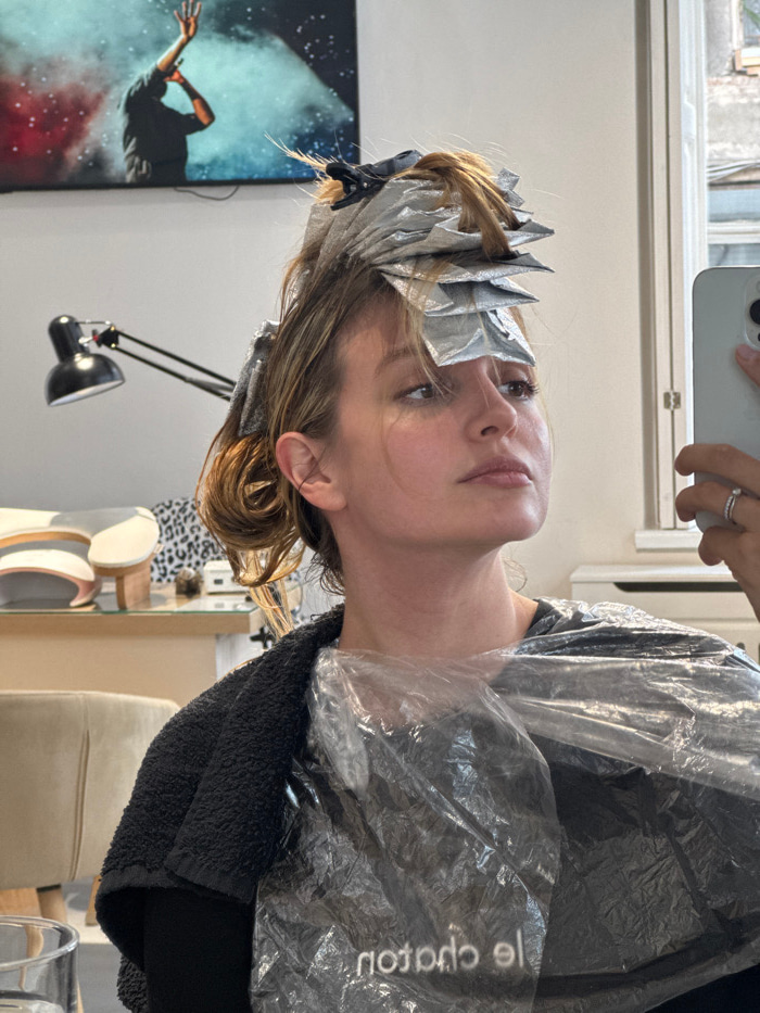 A female individual, appearing to be in her 20s or 30s, is depicted in a salon environment located in Tbilisi, Georgia. Her light brown hair is actively undergoing a chemical treatment, with numerous…read more