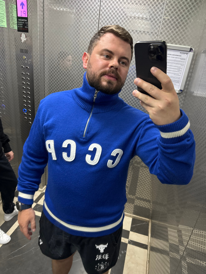A man takes a selfie in an elevator. He wears a blue, zip-neck sweater with white trim and large white letters spelling "CCCP." Black shorts with a logo are visible, and he holds a dark-colored smartp…read more