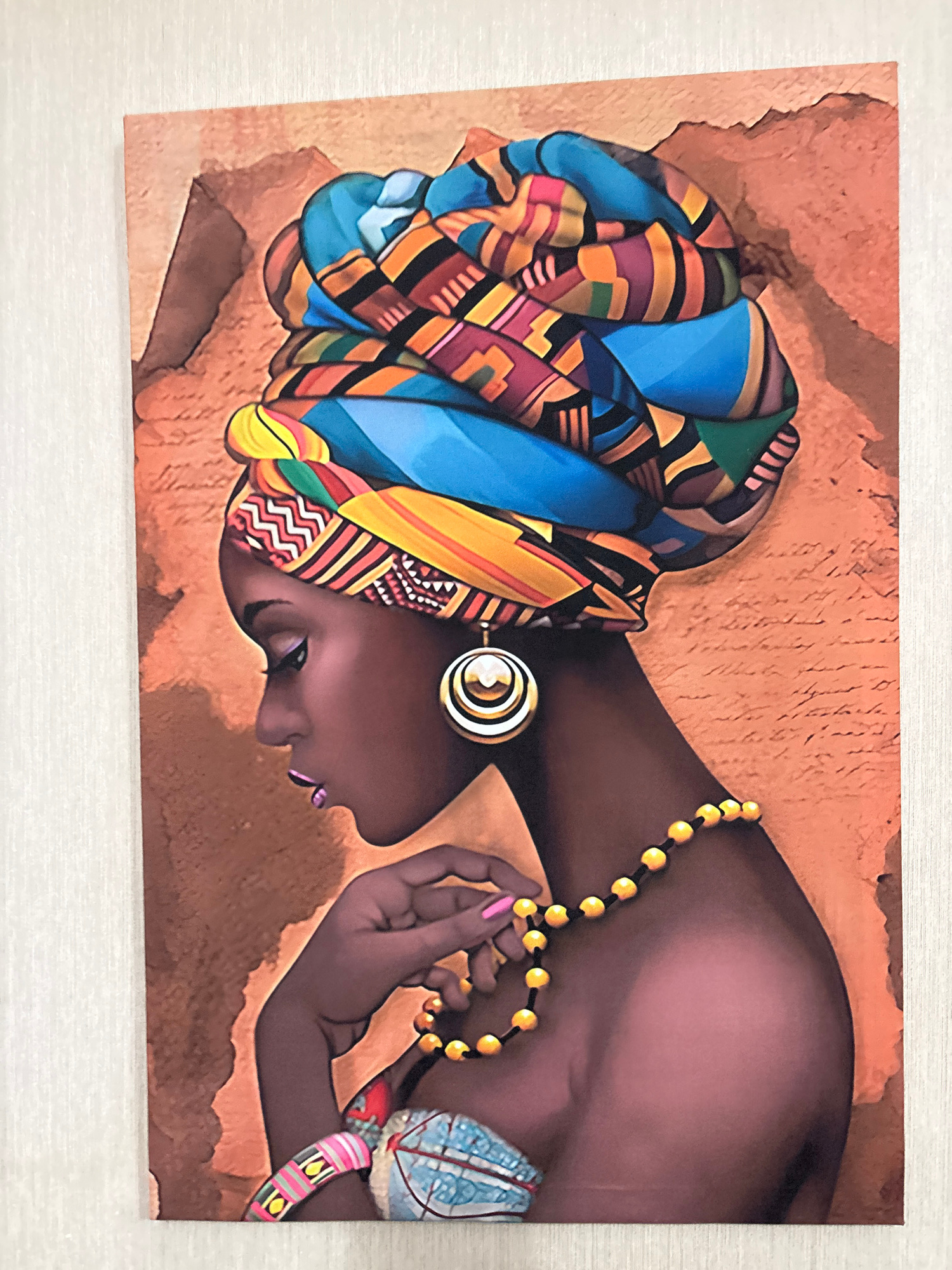 The image shows a portrait of a Black woman with a colorful patterned headwrap. She is wearing a large circular earring and a necklace of yellow beads. Her hand is raised near her face, and she has a…read more