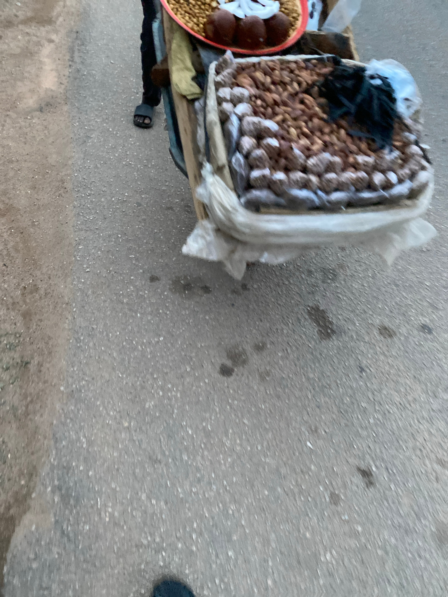 The image displays a ground-level view of a street vendor's stall, likely situated on a paved road or market area in Jos, Nigeria. A wooden stand or cart supports various snack items. The main offerin…read more