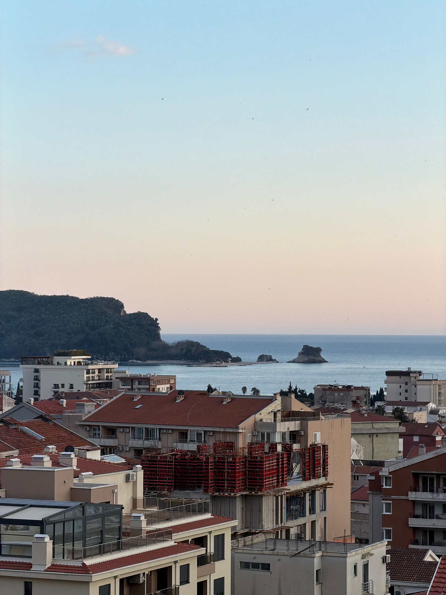 An expansive, high-angle view captures a bustling coastal town, characteristic of Budva, Montenegro, stretching from dense urban development to the serene Adriatic Sea. The image is presented as if ro…read more