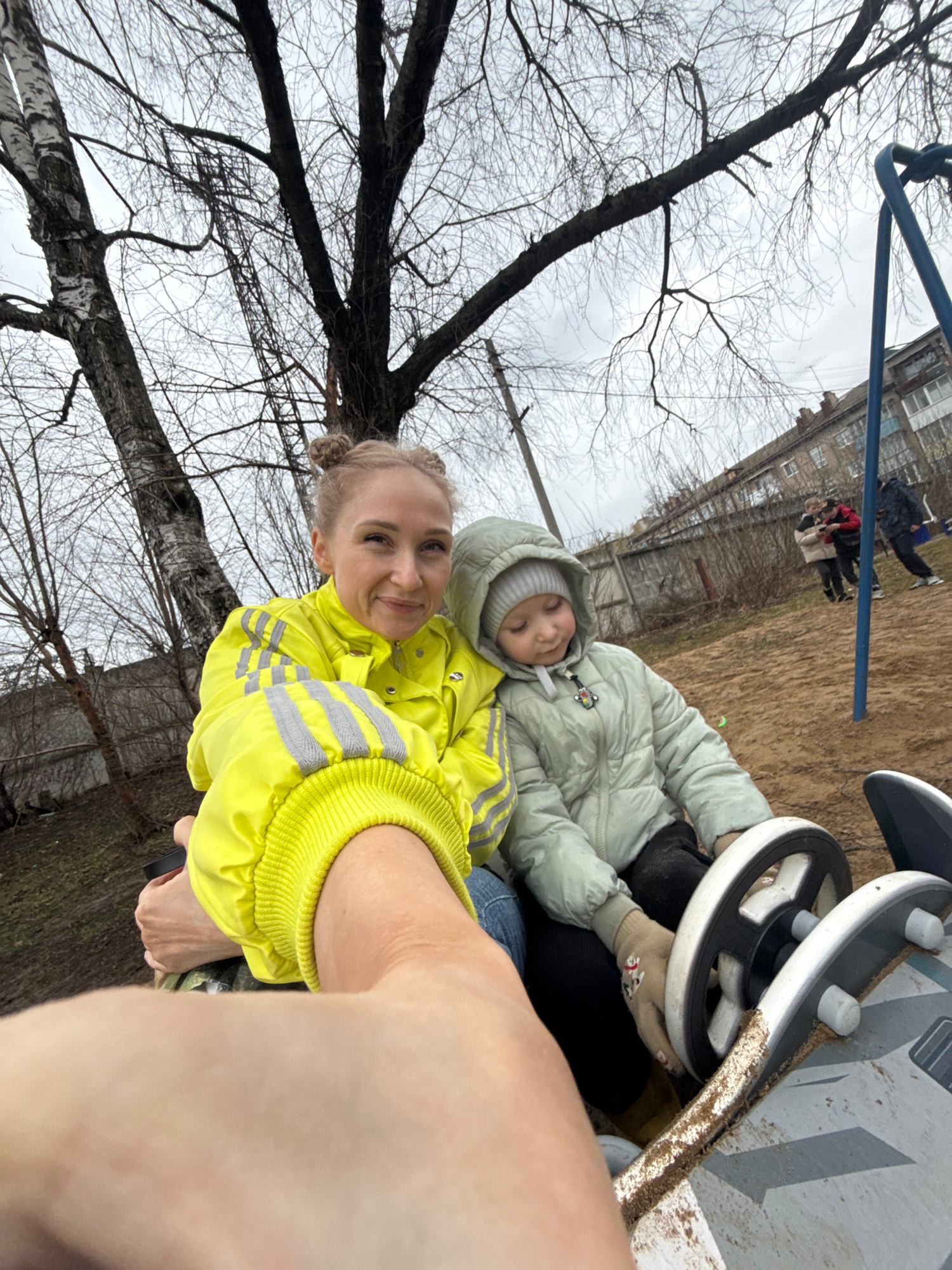 A woman in a yellow jacket and a child in a light green jacket are on a playground. The woman has her hair in buns. The child is wearing a hooded jacket with a grey knit hat underneath and gloves. The…read more